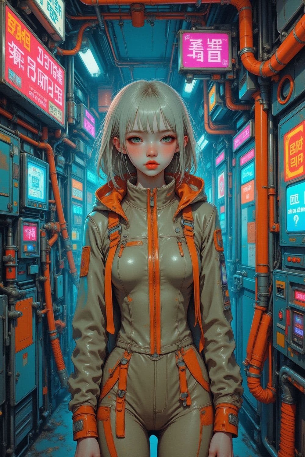 The image depicts a futuristic scene featuring a woman standing in a narrow alley or corridor with cyberpunk aesthetics. The color palette is dominated by neon shades, primarily bright pink, orange, and blue, which illuminate the scene and contribute to the atmospheric lighting. The woman's outfit is a blend of a military-style beige jumpsuit with orange and blue accents, including buttons and a high belt. Her hair is now a short bob in a striking silver color, contrasting with her piercing green eyes, adding to the character's distinctive appearance. The background is filled with various high-tech panels, pipes, and neon signs displaying symbols or characters, consistent with a cyberpunk or futuristic city setting. The overall style is highly detailed, with an emphasis on vivid, contrasting colors and intricate technological details, characteristic of cyberpunk art.