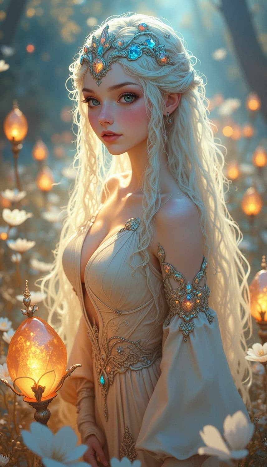 In a luminous, enchanted glade, a captivating female character stands amidst a circle of ancient, glowing stones that pulse with a soft, ethereal light. Her attire is a flowing gown crafted from a fabric that seems to capture the essence of dawn, blending shades of soft gold and pale azure. Her hair, a striking shade of ethereal white, cascades down her back in intricate, flowing waves, framing a face with delicate, serene features. Her eyes, a mesmerizing shade of crystal blue, seem to reflect the mysteries of the glade. She wears a delicate crown made of intertwining vines and tiny, luminescent crystals, enhancing her mystical and otherworldly presence. The background is a breathtaking scene of radiant flora and gentle, glowing streams that weave through the glade, creating a serene and enchanting atmosphere. The style is a blend of fantasy and natural elegance, with a focus on cool color tones and intricate detailing, creating a mesmerizing and otherworldly atmosphere.