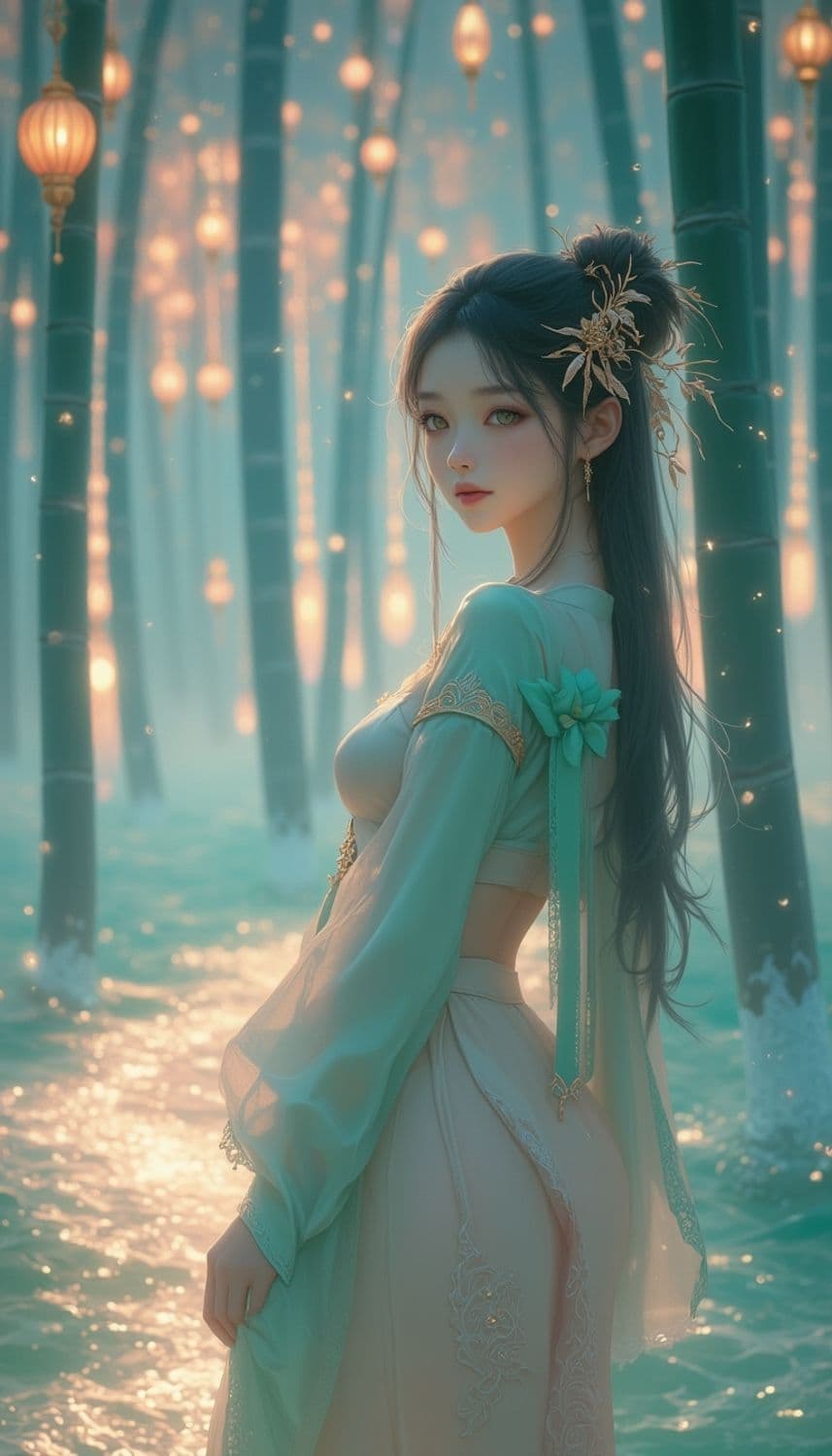 In a mystical, ethereal realm of floating, luminescent bamboo forests under a sky painted with the colors of a serene dawn, a captivating female figure stands poised on a shimmering, translucent bamboo bridge. Her attire is a flowing, elegant hanfu crafted from a fabric that seems to capture the essence of dawn's embrace, blending shades of soft jade and shimmering gold. Her hair, a striking shade of dawn aubergine, cascades down her back in intricate, flowing tendrils, framing a face with delicate, serene features and a gentle, contemplative smile. Her eyes, a mesmerizing shade of bamboo green, seem to reflect the mysteries of the tranquil forest. She wears a delicate hairpin adorned with tiny, luminescent bamboo leaves and golden filigree, enhancing her celestial and otherworldly presence. The background is a breathtaking scene of luminescent bamboo forests and gentle, glowing streams of dawn light that weave through the realm, creating a serene and enchanting atmosphere. The style is a blend of fantasy and forest elegance, with a focus on soft color tones and intricate detailing, creating a mesmerizing and otherworldly atmosphere.