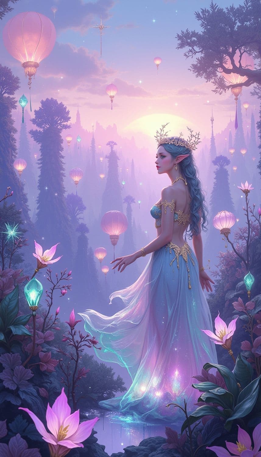 In a mystical, ethereal realm of floating, luminescent forest canopies under a sky painted with the colors of a serene dawn, a captivating female figure stands poised on a shimmering, translucent leaf platform. Her attire is a flowing, elegant gown crafted from a fabric that seems to capture the essence of woodland grace, blending shades of soft emerald and shimmering gold. Her hair, a striking shade of forest green, cascades down her back in intricate, flowing braids, framing a face with delicate, serene features and a gentle, knowing smile. Her eyes, a mesmerizing shade of leaf green, seem to reflect the mysteries of the forest world. She wears a delicate crown adorned with tiny, luminescent leaf patterns and golden vines, enhancing her celestial and otherworldly presence. The background is a breathtaking scene of luminescent forest canopies and gentle, glowing streams of dawn light that weave through the realm, creating a serene and enchanting atmosphere. The style is a blend of fantasy and woodland elegance, with a focus on cool color tones and intricate detailing, creating a mesmerizing and otherworldly atmosphere.