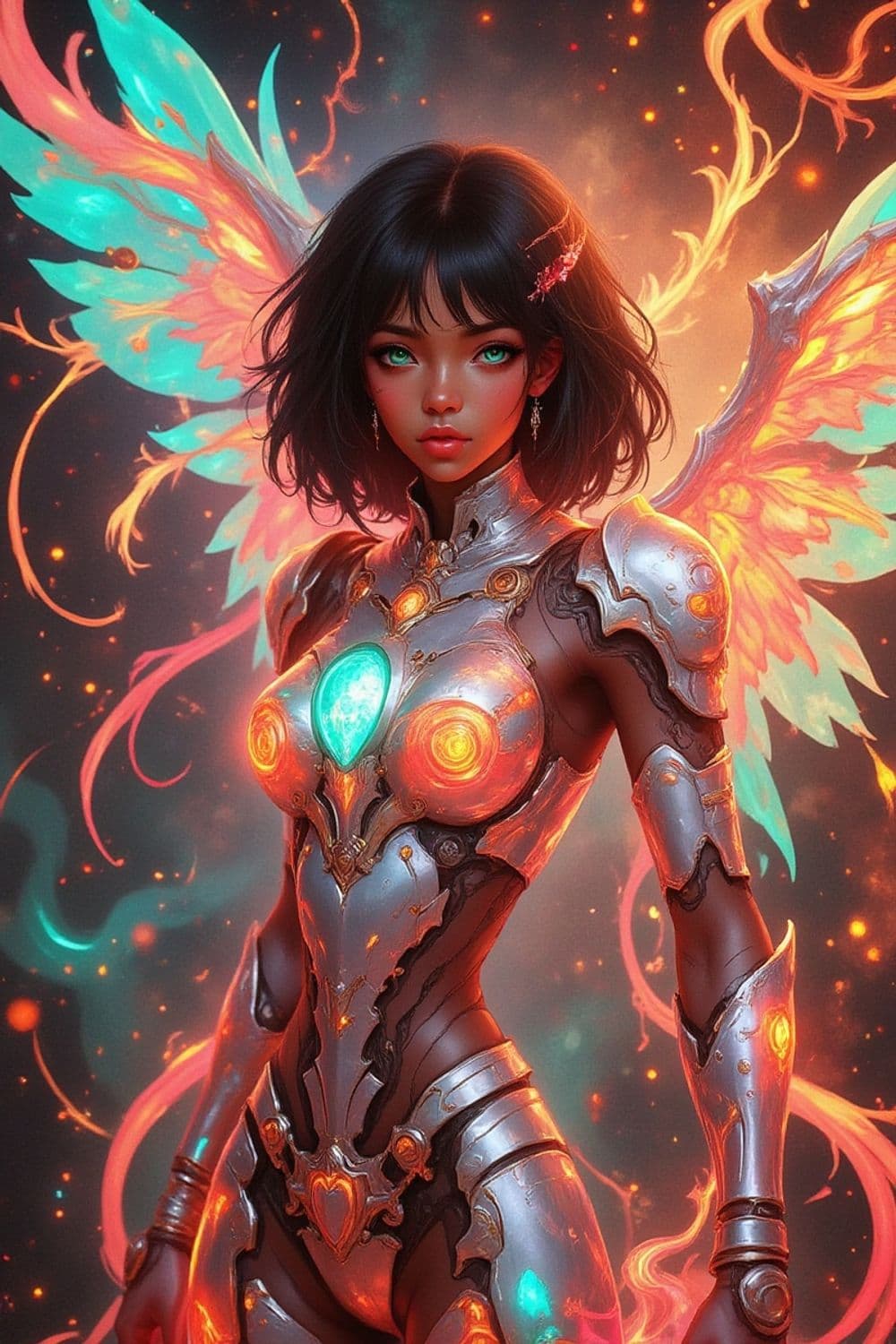 The image depicts a highly detailed and stylized fantasy character resembling a cybernetic angel. The character is female with dark skin, short, curly black hair, and bright, captivating green eyes. She wears intricate silver armor with glowing elements throughout, giving a futuristic and cyberpunk aesthetic. Her armor is adorned with mechanical components and luminous accents in shades of blue and orange. The wings are butterfly-like, showcasing a striking contrast in colors with a vibrant glow of blue and red-orange, further reinforcing the fantasy theme. The background is blurred with hints of orange sparks, suggesting dynamic motion and a high-energy environment. The overall style is reminiscent of digital art or a concept illustration, emphasizing vivid colors and elaborate detail.