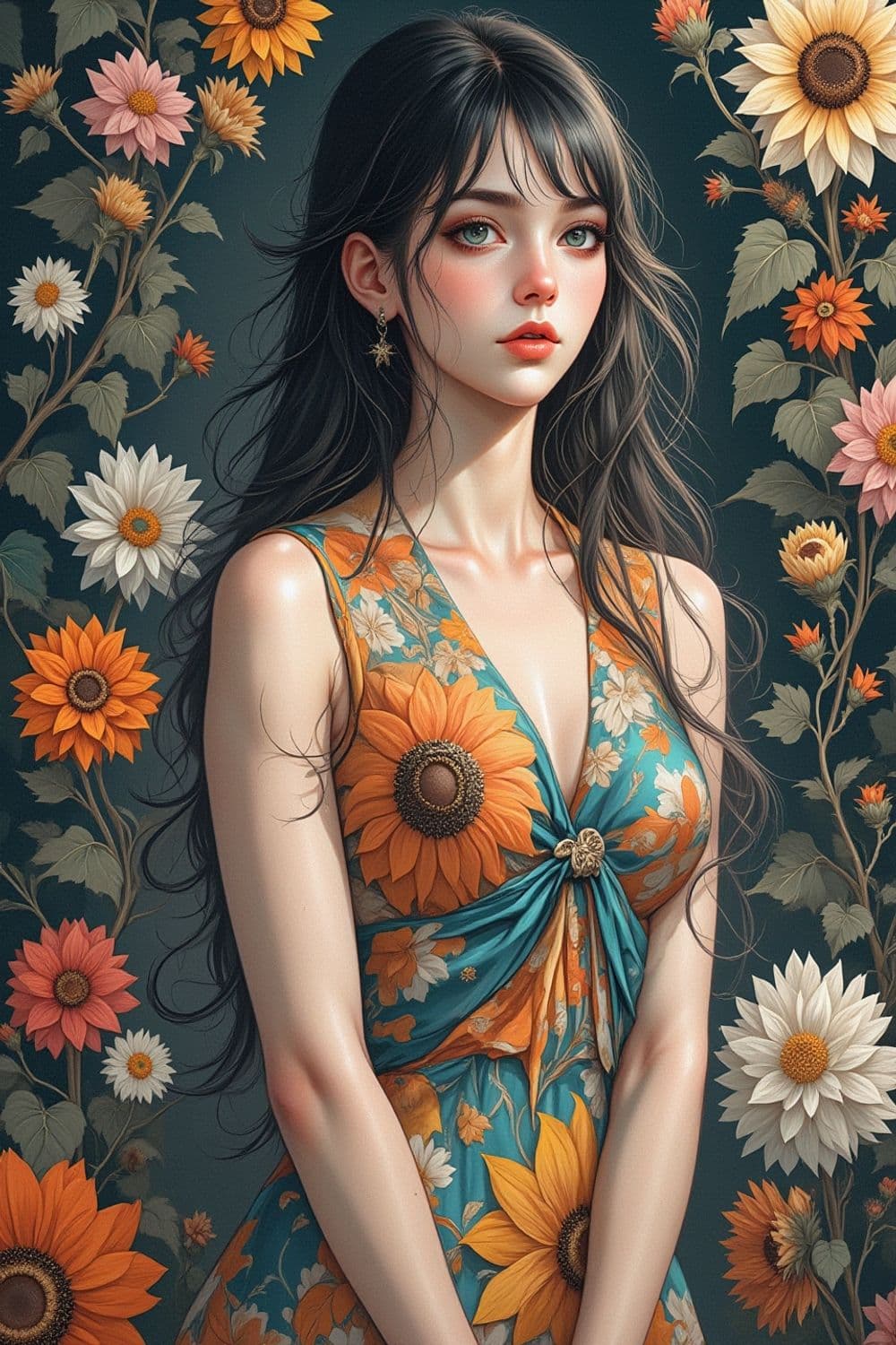 A captivating portrait of a woman with long dark hair, adorned with a floral dress featuring vivid sunflowers and daisies. Her serene expression is highlighted by soft blush and subtle eyeshadow. The background is a harmonious blend of sunflowers and other floral blooms, enhancing the natural beauty and elegance of the scene.