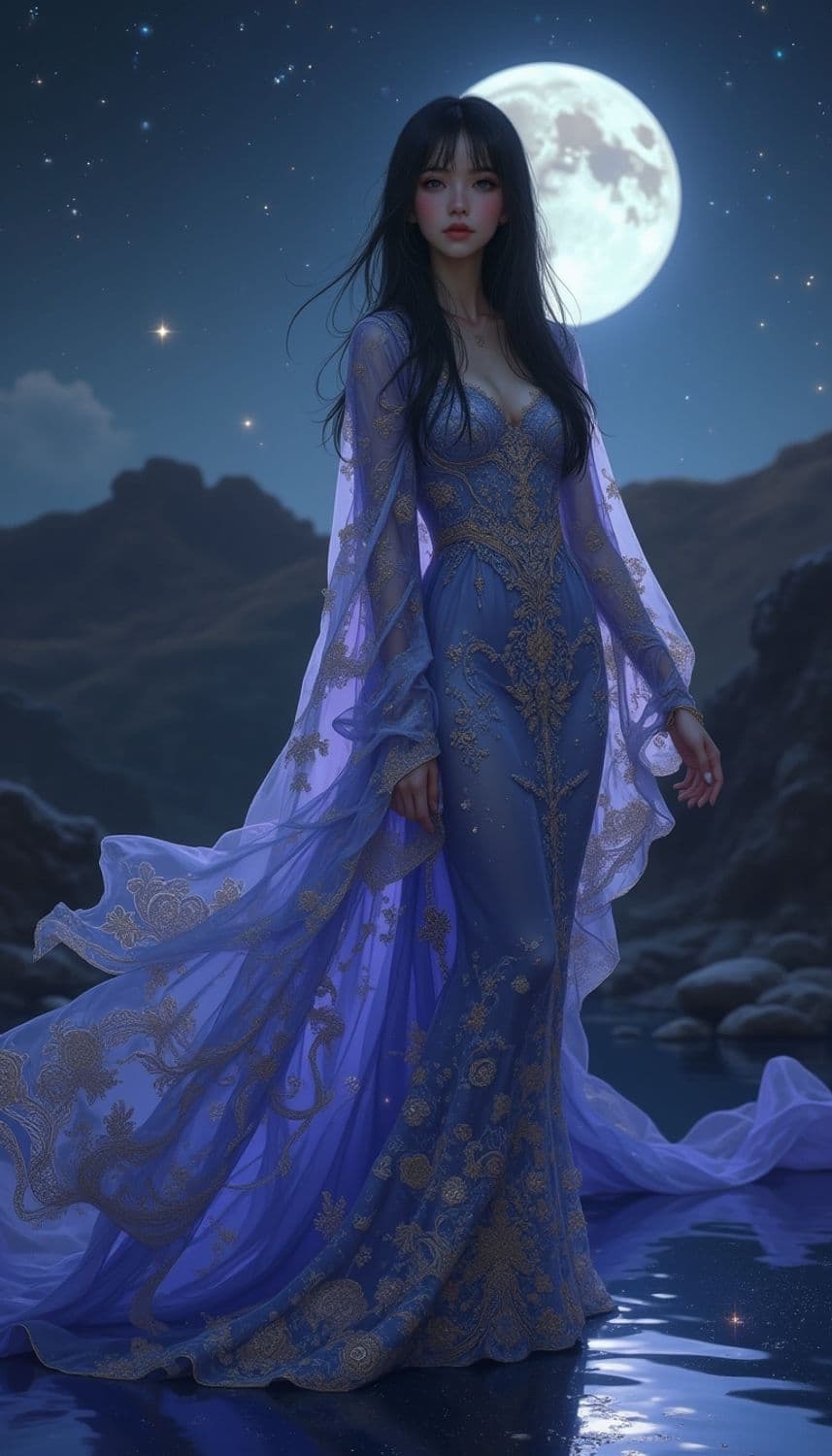 A serene scene under a moonlit sky featuring a woman with long dark hair wearing an intricate, flowing gown of deep blue and ornate gold embroidery. She stands gracefully near a tranquil water body, surrounded by rugged hills. The full moon enhances the mystical ambiance with its radiant glow, casting reflections and soft light upon the landscape.