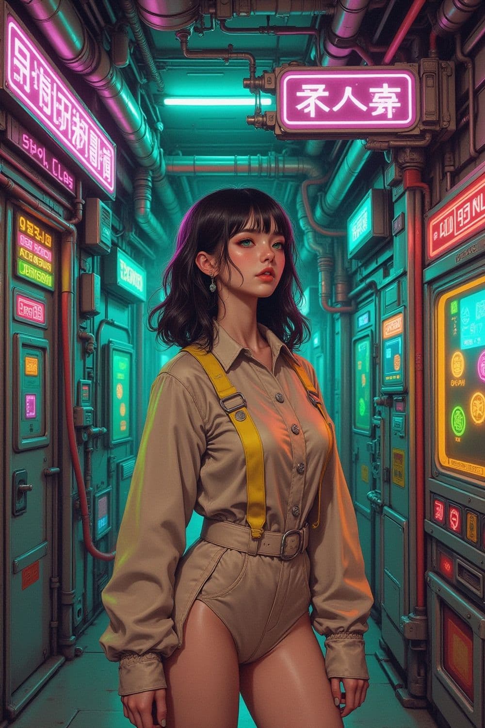 A futuristic scene set in a neon-lit corridor where a young woman with short black hair stands confidently. She wears a beige shirt with yellow suspenders and shorts. The corridor is lined with pipes and illuminated signs in vibrant teal and purple hues, adding a cyberpunk aesthetic.