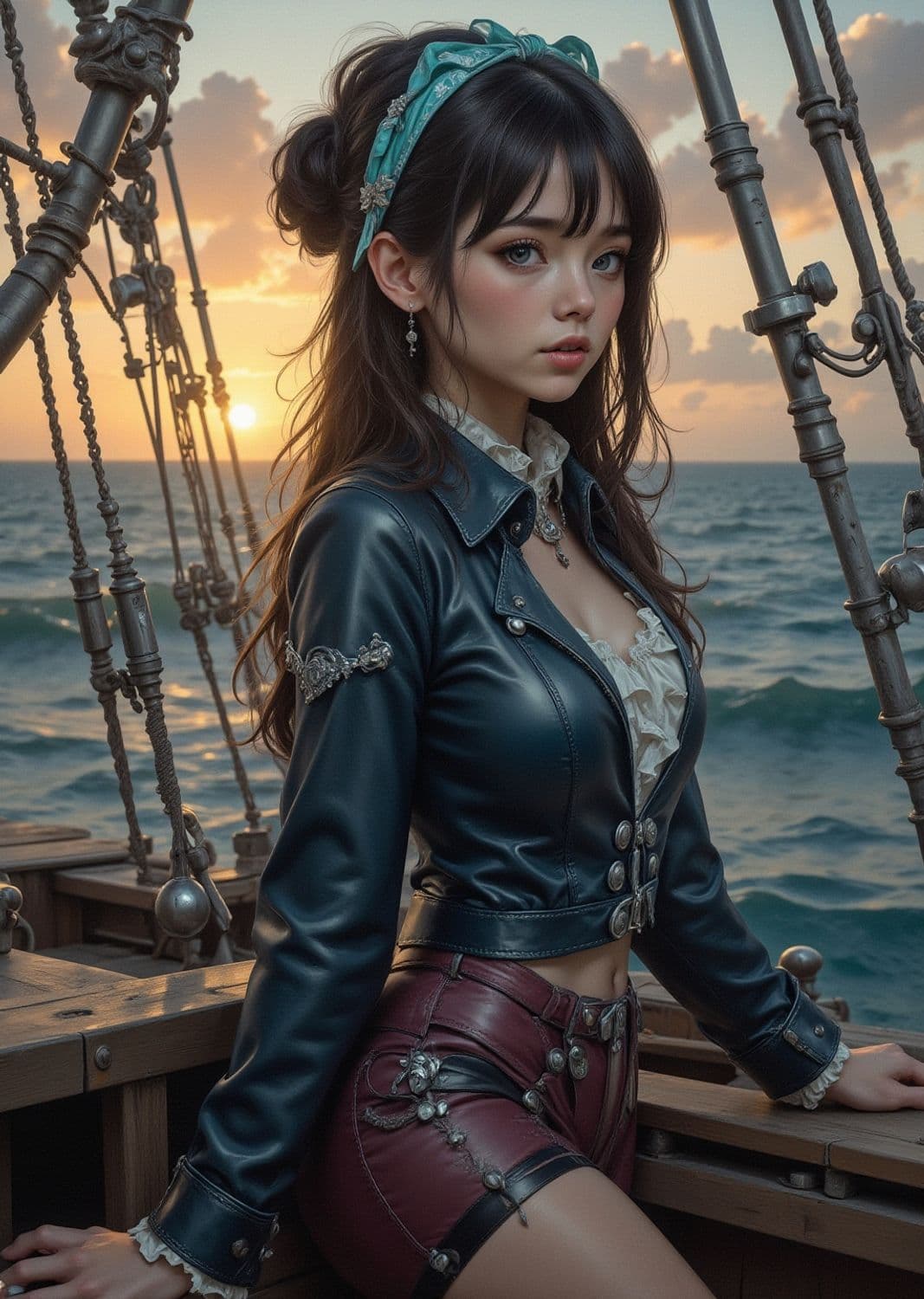 The image shows a young woman standing on the deck of a ship at sunset. She is wearing a blue leather jacket with ornate detailing and maroon shorts adorned with metallic embellishments. Her hair is styled with a blue headband and loose curls, and she gazes into the distance with a serene expression. The backdrop features a sunset over the ocean, with the ship's ropes and mast partially visible.