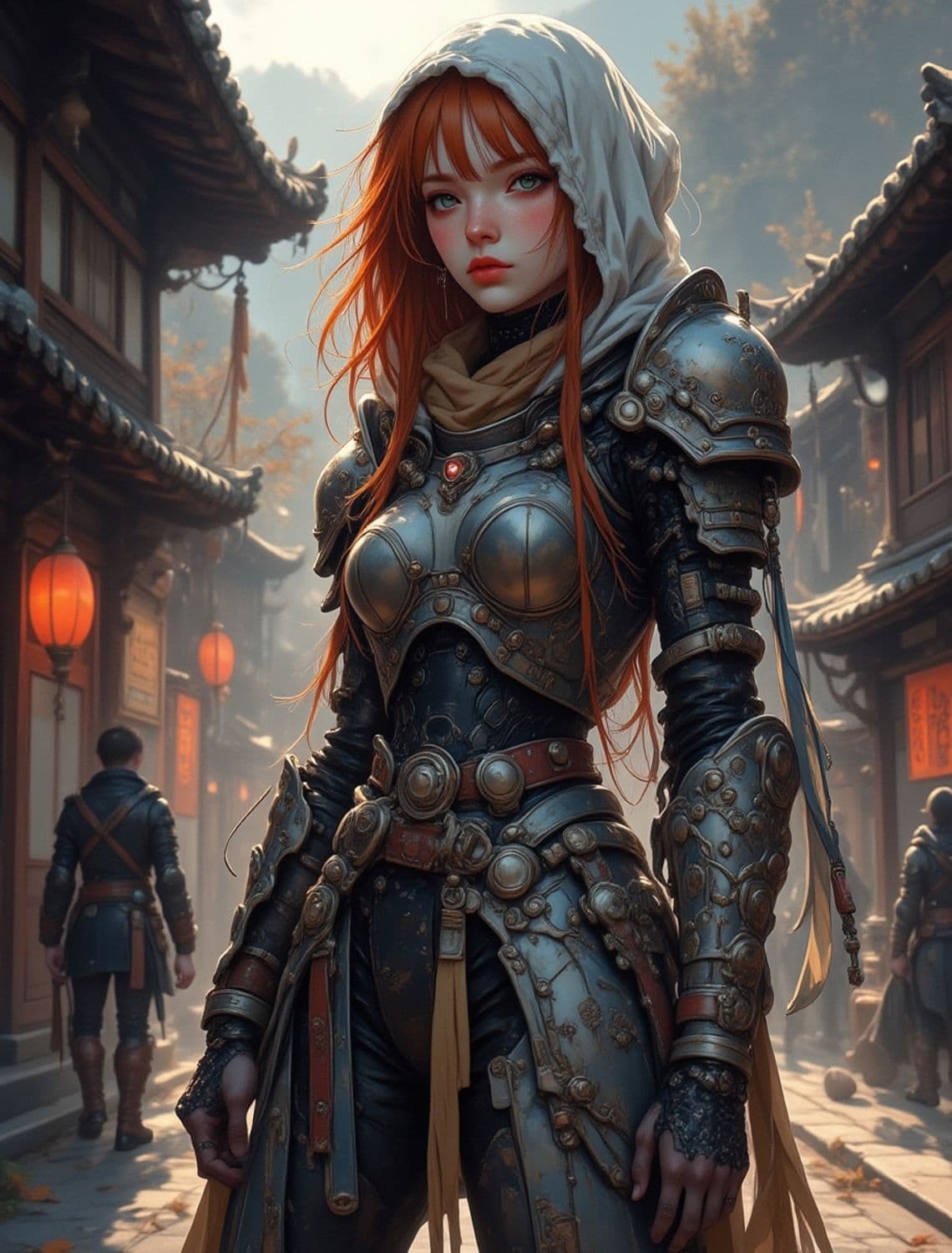 A striking warrior with vibrant red hair stands in a traditional, lantern-lit street. She wears elaborately detailed armor adorned with intricate patterns and metallic embellishments. Her intense gaze and the serene setting create an aura of strength and mystique.