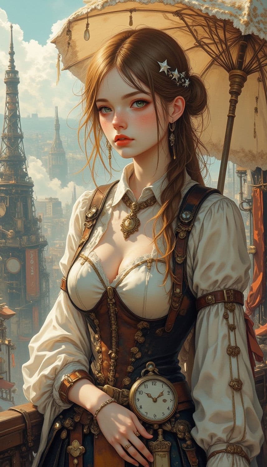 A steampunk-themed character stands gracefully under a cream-colored parasol. She is adorned in an elaborate leather and fabric ensemble, featuring intricate buttons and an ornate clock attached to her belt. Her hair is styled with delicate star-shaped pins, and her expression exudes elegance against the backdrop of towering steampunk structures and a cloudy sky.