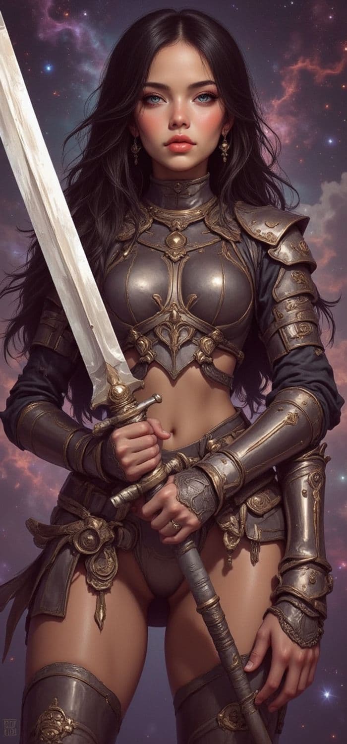 A strong, female warrior stands boldly against a cosmic backdrop. She is clad in ornate, metallic armor, showcasing intricate designs and craftsmanship. Her long, dark hair cascades over her shoulders, and she wields a large, imposing sword confidently in her hands. The celestial background adds an ethereal and majestic quality to the image, enhancing the sense of fantasy and adventure.