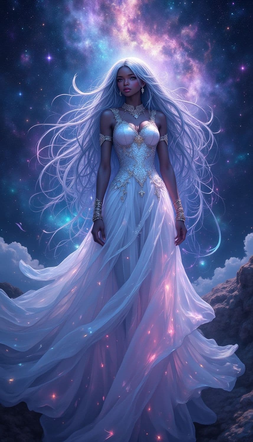 A mystical figure stands under a vibrant, cosmic sky filled with swirling stars and nebulae. She is adorned in an elegant, flowing white gown that sparkles with ethereal light. Her long, wavy silver hair cascades down her shoulders, adding to her enchanting presence. The background features a stunningly detailed galaxy, enhancing the otherworldly atmosphere.