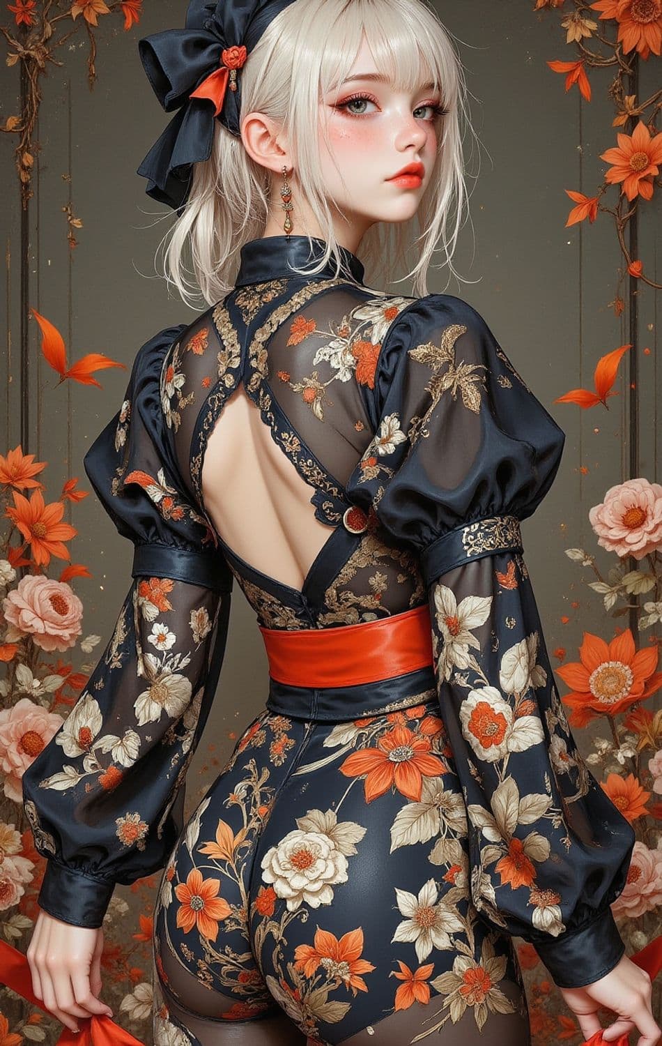 The image showcases a character with platinum blonde hair styled in a chic updo, adorned with a large black and red hair bow. She is wearing a detailed, floral-patterned dress with sheer sleeves and an open-back design, intricately embroidered with orange and gold blossoms. Her attire is complemented by a bold red belt and intricate earrings. The backdrop features harmonious orange and peach flowers, enhancing the intricate floral theme.