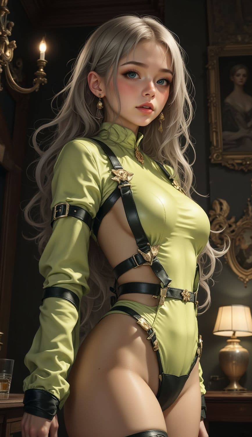 The image depicts a young woman with long, flowing hair dressed in a stylish, form-fitting outfit featuring bold black leather straps and gold accents. The setting is a richly decorated room with ornate furnishings and paintings, illuminated by warm lighting.