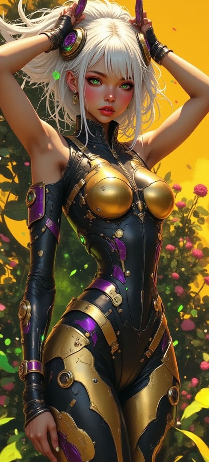 The image features a futuristic female character with striking green eyes and bright white hair. She is wearing a sleek, high-tech bodysuit with gold and purple accents. Her attire includes intricate mechanical elements, suggesting a blend of technology and fashion. The background is vivid, filled with lush greenery and pink flowers, creating a vivid contrast with her outfit. The scene is bathed in warm, golden light.