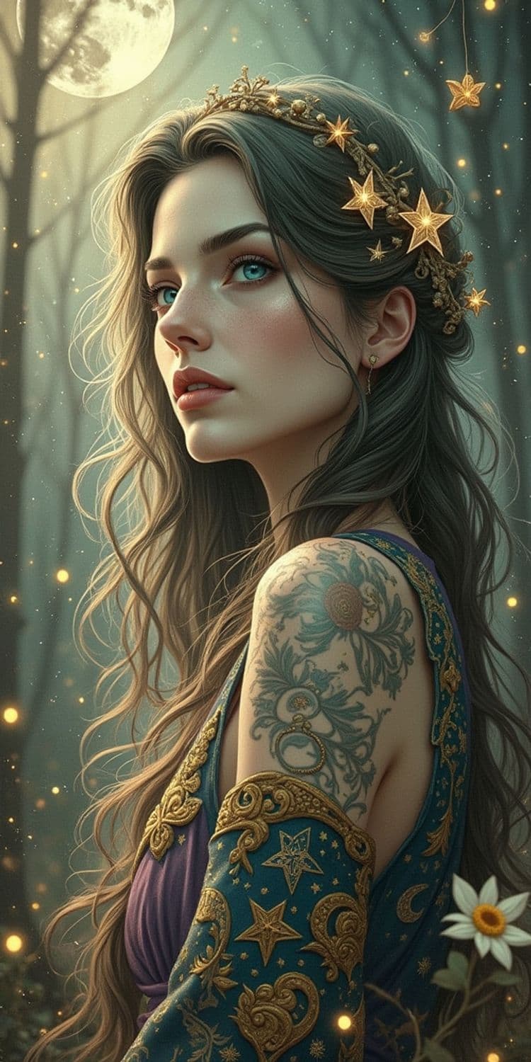 The image portrays a young woman with long, flowing dark hair adorned with golden star ornaments, standing in an ethereal forest setting. Her expression is serene and introspective as she gazes into the distance. She wears a richly detailed garment with intricate golden embroidery featuring star and celestial motifs on a deep blue fabric. Her sleeve is adorned with similar patterns in gold. A prominent tattoo with floral designs covers her upper arm, adding to the mystical appearance. In the background, a large, luminous full moon glows among the strategically blurred trees, casting a soft light across the scene. Small glowing orbs, resembling fireflies, float around her, enhancing the magical ambiance. The overall style is fantasy art, with a focus on rich, detailed textures and a moody color palette that combines cool tones of blue with warm golds and earth tones.