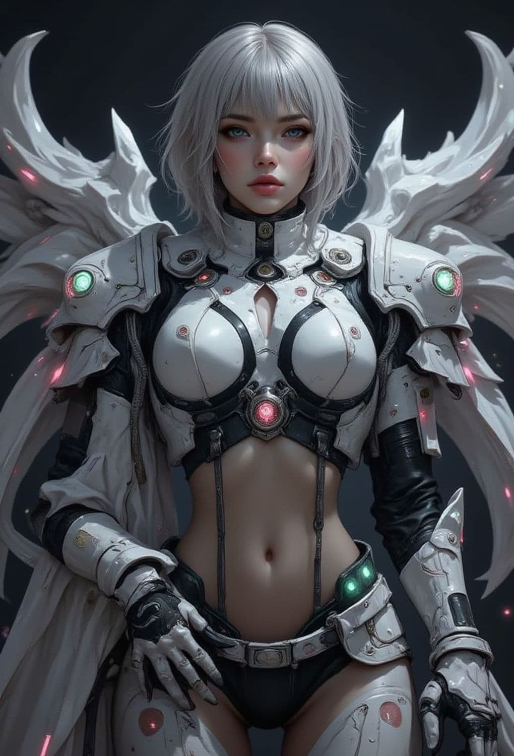 A futuristic female warrior with short white hair wears sleek, advanced armor. Her armor features glowing lights on the chest and shoulders, and intricate mechanical details throughout. Behind her are mechanical wings that add a powerful, angelic appearance.