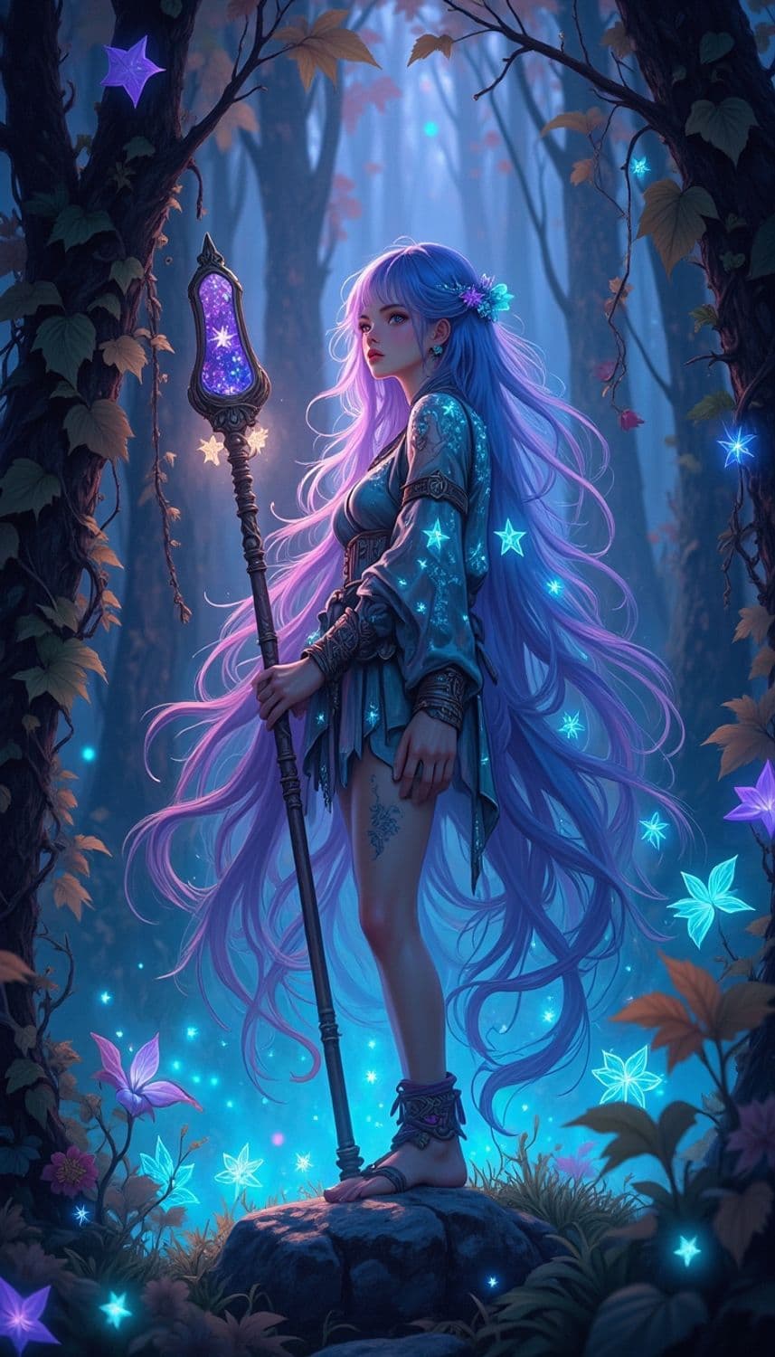 The image depicts a mystical scene in an enchanted forest. A serene figure with long, flowing lavender hair stands amidst the trees, holding a staff that emanates a soft, starry glow. Her attire is adorned with star motifs that match the luminescent flora around her. The atmosphere is filled with a gentle, magical ambiance, enhanced by the soft glow of star-shaped lights scattered throughout the forest.