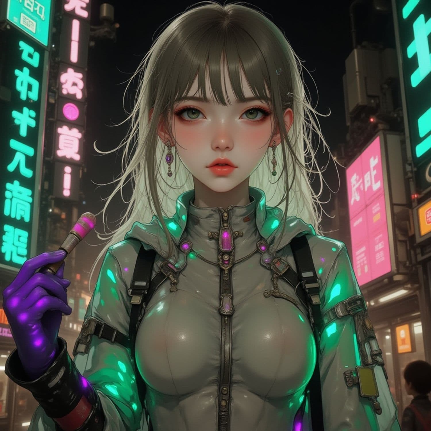 The image depicts a futuristic, anime-style female character standing amidst a neon-lit urban backdrop. She has long, light-colored hair and striking makeup, featuring prominent eye makeup and rosy cheeks. Her attire is a sleek, high-tech jacket adorned with glowing elements and she is holding a small, glowing object in her hand. The city background is bustling with colorful, illuminated signs written in Asian script, adding a cyberpunk ambiance.