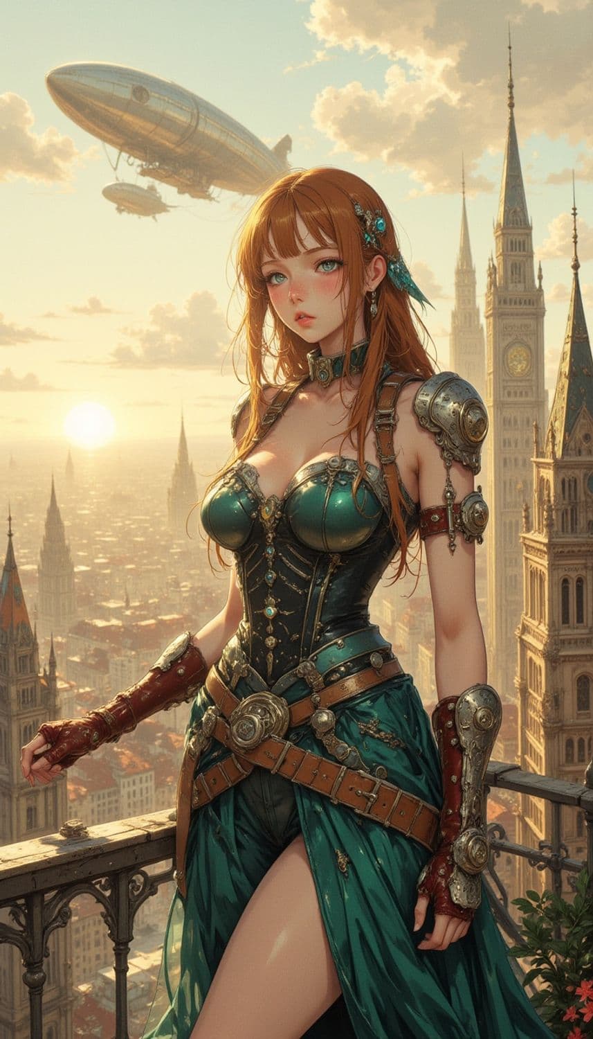 A steampunk-inspired character stands on a balcony with a cityscape background. She wears an intricately designed armored dress with metallic accents, complemented by a brown leather belt and gloves. Her long red hair is styled with decorative clips, and a zeppelin flies in the sky above tall, spired buildings, silhouetted by a setting sun.