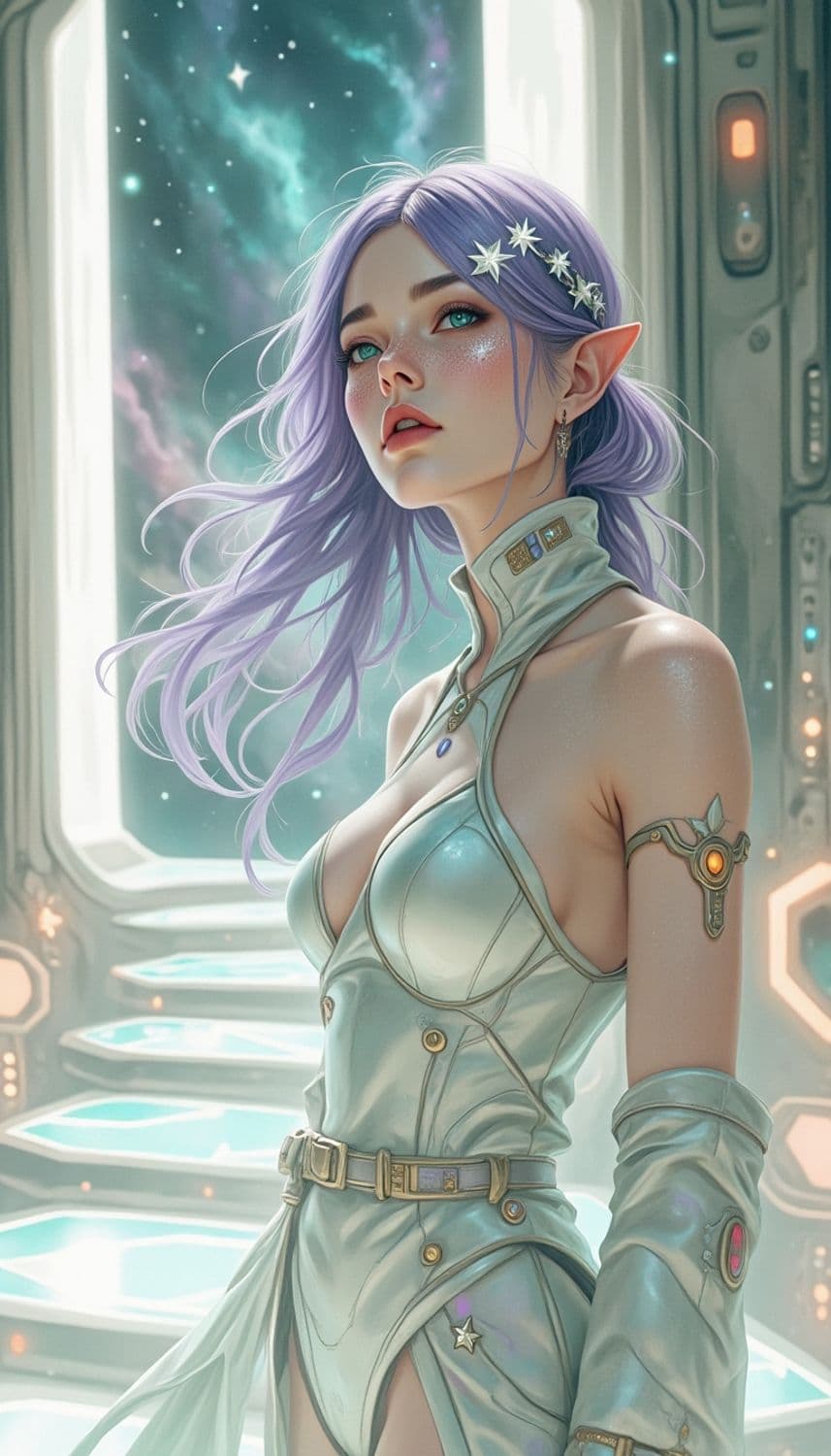 In a futuristic, ethereal realm of floating, luminescent hexagonal platforms under a sky filled with swirling, vibrant stardust, a captivating female figure stands poised on a radiant, translucent stage. Her attire is a sleek, form-fitting tunic crafted from a fabric that seems to capture the essence of cosmic dawn, blending shades of radiant silver and shimmering emerald. Her hair, a striking shade of stardust purple, flows freely around her in a cascade of intricate, gravity-defying spirals, framing a face with delicate, angular features. Her eyes, a mesmerizing shade of cosmic azure, seem to reflect the mysteries of the universe. She wears a delicate circlet adorned with tiny, luminescent circuits and holographic star patterns, enhancing her celestial and otherworldly presence. The background is a breathtaking scene of floating hexagonal platforms and gentle, glowing streams of cosmic light that weave through the realm, creating a serene and enchanting atmosphere. The style is a fusion of sci-fi and cosmic elegance, with a focus on vibrant color tones and intricate detailing, creating a mesmerizing and otherworldly atmosphere.