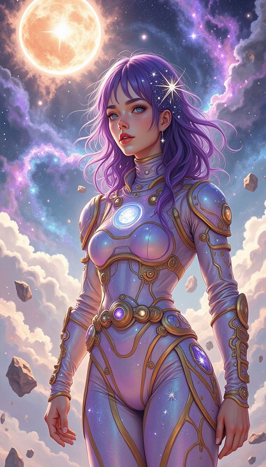 In a futuristic, ethereal realm of floating, luminescent asteroid fields under a sky filled with swirling, vibrant cosmic storms, a captivating female figure stands poised on a gleaming, transparent asteroid platform. Her attire is a sleek, form-fitting exosuit crafted from a fabric that seems to capture the essence of celestial dynamism, blending shades of radiant violet and shimmering gold. Her hair, a striking shade of galaxy purple, flows freely around her in a cascade of intricate, gravity-defying curls, framing a face with delicate, angular features and a confident, mysterious smile. Her eyes, a mesmerizing shade of comet blue, seem to reflect the mysteries of the cosmos. She wears a delicate helmet adorned with tiny, luminescent star patterns and holographic cosmic symbols, enhancing her celestial and otherworldly presence. The background is a breathtaking scene of floating asteroid fields and gentle, glowing streams of cosmic energy that weave through the realm, creating a serene and enchanting atmosphere. The style is a fusion of sci-fi and cosmic elegance, with a focus on vibrant color tones and intricate detailing, creating a mesmerizing and otherworldly atmosphere.