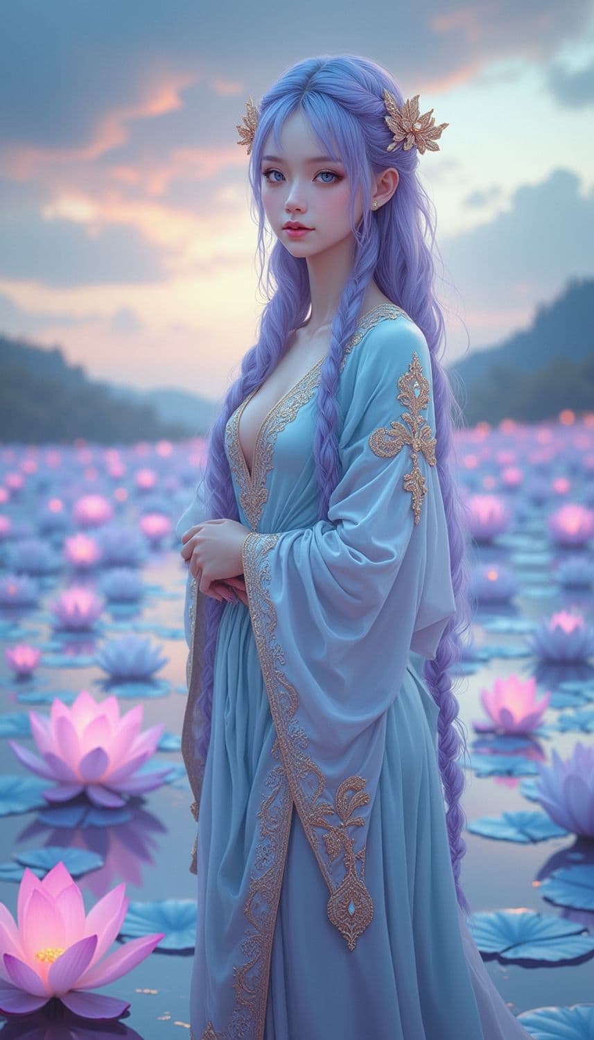 In a mystical, ethereal realm of floating, luminescent lotus ponds under a sky painted with the colors of a serene dusk, a captivating female figure stands poised on a shimmering, translucent lotus platform. Her attire is a flowing, elegant sari crafted from a fabric that seems to capture the essence of tranquil waters, blending shades of soft cyan and shimmering gold. Her hair, a striking shade of twilight lavender, cascades down her back in intricate, flowing braids, framing a face with delicate, serene features and a gentle, contemplative smile. Her eyes, a mesmerizing shade of lotus pink, seem to reflect the mysteries of the aquatic world. She wears a delicate headpiece adorned with tiny, luminescent lotus petals and golden filigree, enhancing her celestial and otherworldly presence. The background is a breathtaking scene of luminescent lotus ponds and gentle, glowing streams of dusk light that weave through the realm, creating a serene and enchanting atmosphere. The style is a blend of fantasy and aquatic elegance, with a focus on cool color tones and intricate detailing, creating a mesmerizing and otherworldly atmosphere.