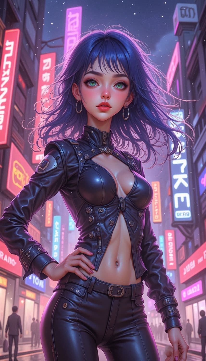 A stylized digital artwork featuring a young woman with striking blue hair standing confidently in an urban street lit by vibrant neon signs. She wears a black, form-fitting leather outfit accessorized with large hoop earrings. The background showcases a bustling cityscape with other figures walking amidst the bright, colorful lights.