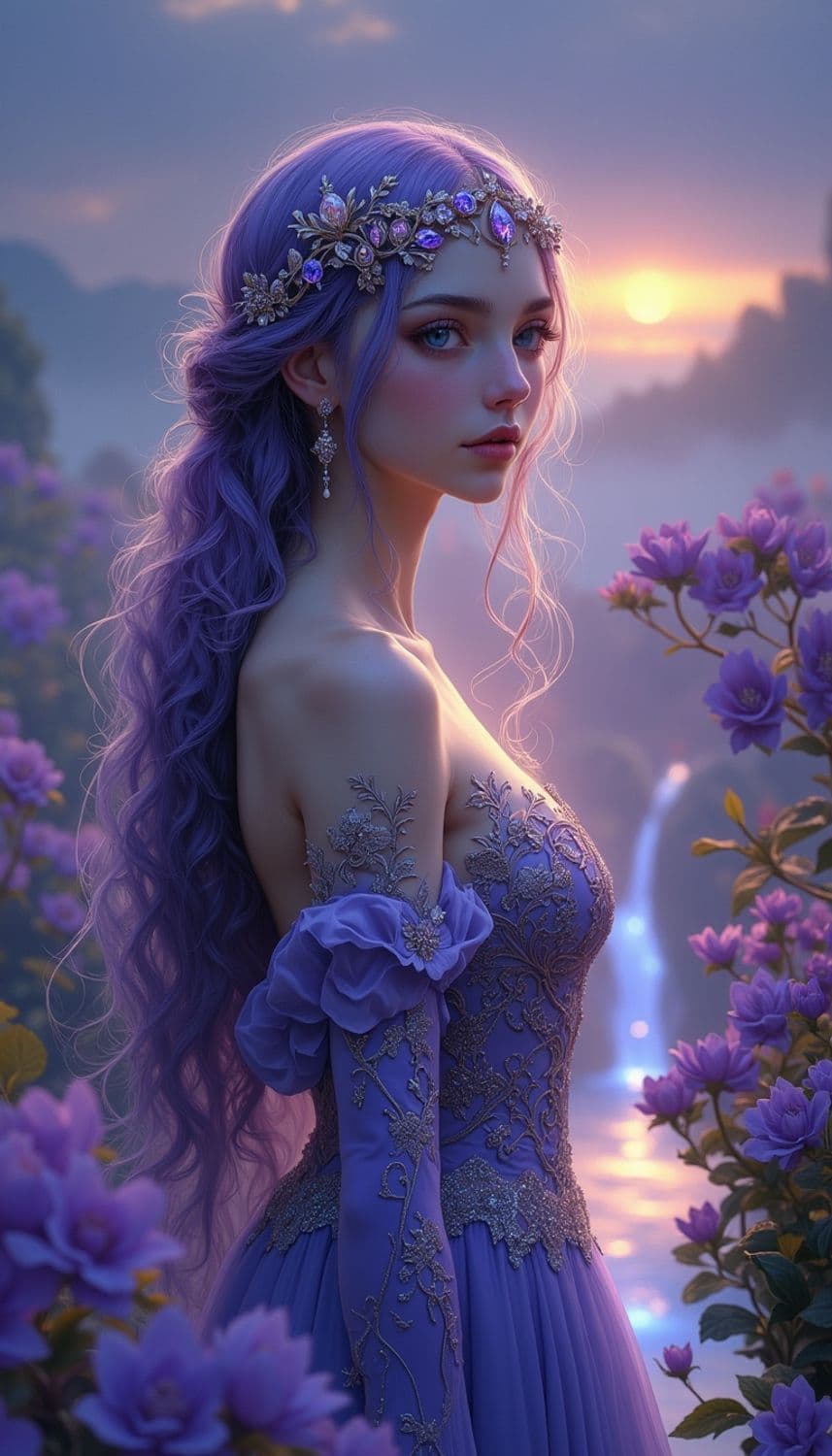 In a mystical, ethereal realm of floating, luminescent gardens under a sky painted with the hues of twilight, a captivating female figure stands amidst a cascade of luminescent blossoms. Her attire is a flowing gown crafted from a fabric that seems to capture the essence of twilight, blending shades of deep indigo and shimmering gold. Her hair, a striking shade of twilight violet, cascades down her back in intricate, flowing waves, framing a face with delicate, serene features. Her eyes, a mesmerizing shade of twilight amethyst, seem to reflect the mysteries of the evening sky. She wears a delicate tiara made of intertwining twilight vines and tiny, luminescent amethysts, enhancing her celestial and otherworldly presence. The background is a breathtaking scene of luminescent gardens and gentle, glowing streams that weave through the realm, creating a serene and enchanting atmosphere. The style is a blend of fantasy and celestial elegance, with a focus on vibrant color tones and intricate detailing, creating a mesmerizing and otherworldly atmosphere.
