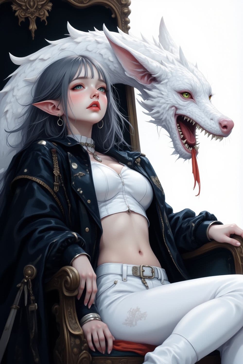 A striking fantasy art piece featuring a woman with long silver hair and sharp ears, lounging regally on an ornate chair. She wears a leather jacket over a white crop top and high-waisted pants. Her appearance is complemented by elegant jewelry. An ethereal white dragon with piercing eyes and an open mouth gracefully coils behind her, adding a mystical aura to the scene.