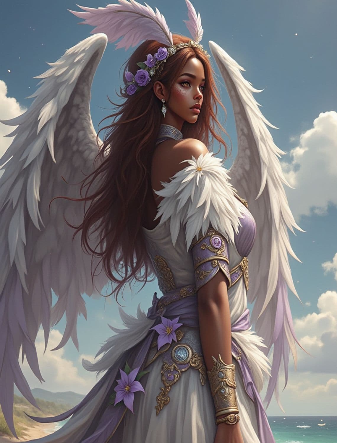 The image depicts a celestial figure, an ethereal woman with elegant wings, dressed in a flowing white gown adorned with purple flowers and intricate golden embellishments. She gazes with a serene and slightly mysterious expression, her long hair cascading down her back. A diadem with purple roses and delicate feathers crowns her head, contrasting beautifully against the blue sky filled with fluffy clouds in the background.
