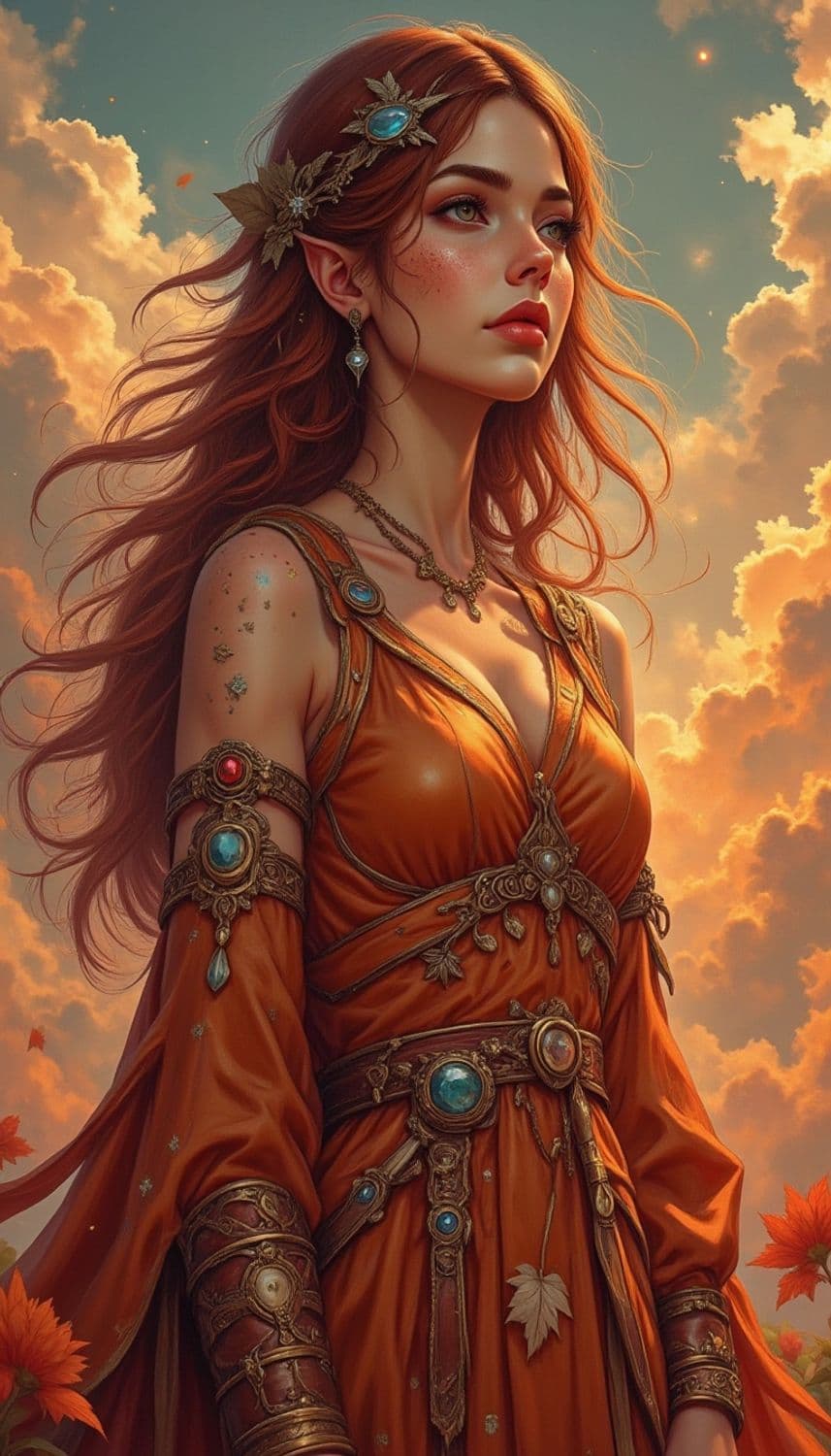 A mystical female figure with long red hair stands against a backdrop of golden, sunlit clouds. She wears an orange gown adorned with ornate jewelry featuring blue gemstones. Her face, adorned with freckles and delicate earrings, is serene and ethereal. The scene is framed with autumn leaves, enhancing the warm ambiance.