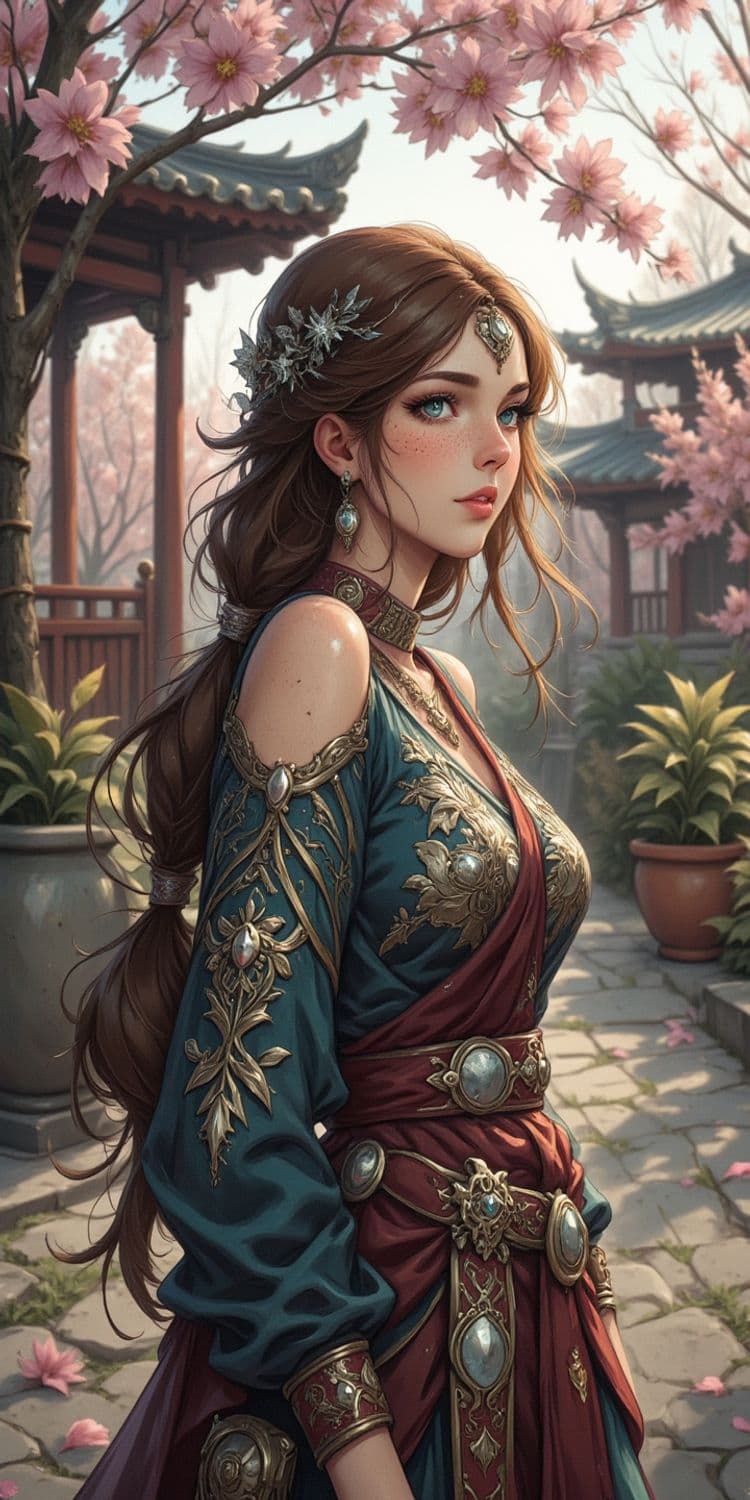 The image portrays a woman with long, flowing brown hair adorned with floral and jeweled accessories. She is dressed in an intricately designed gown featuring ornate patterns and jewels. The background includes a serene garden setting with blooming cherry blossoms and traditional architecture, evoking a sense of elegance and tranquility.