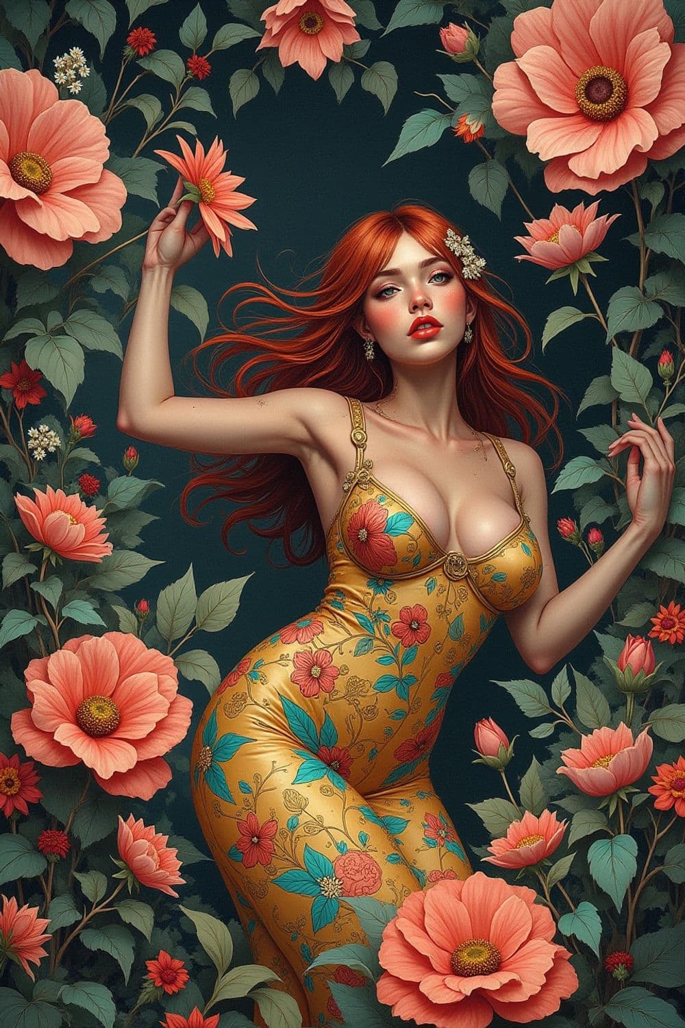 A captivating figure with flowing red hair is surrounded by large, blooming coral-colored flowers. She wears a form-fitting gold dress adorned with exquisite red and turquoise floral patterns, perfectly complementing the vibrant flowers around her. Her graceful posture and serene expression enhance the dreamlike quality of the scene.
