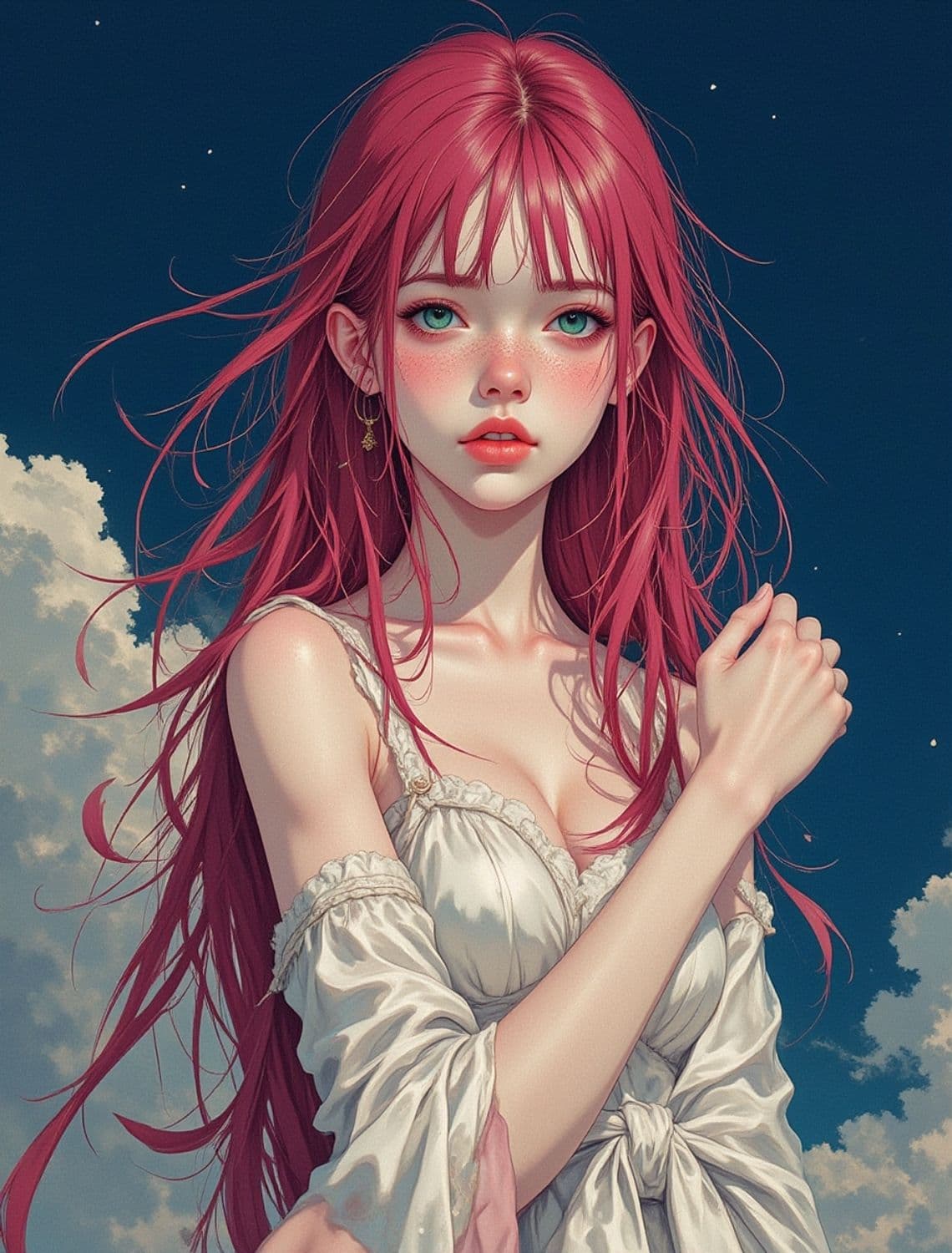 A striking artwork depicting a young woman with long, flowing pink hair against a starry night sky. Her large, expressive green eyes and softly blushed cheeks give her an ethereal appearance. She wears an off-shoulder white dress with intricate lace details, and her posture suggests a gentle, thoughtful demeanor. The background features soft clouds contrasting with the dark blue sky, creating a serene and dreamlike atmosphere.
