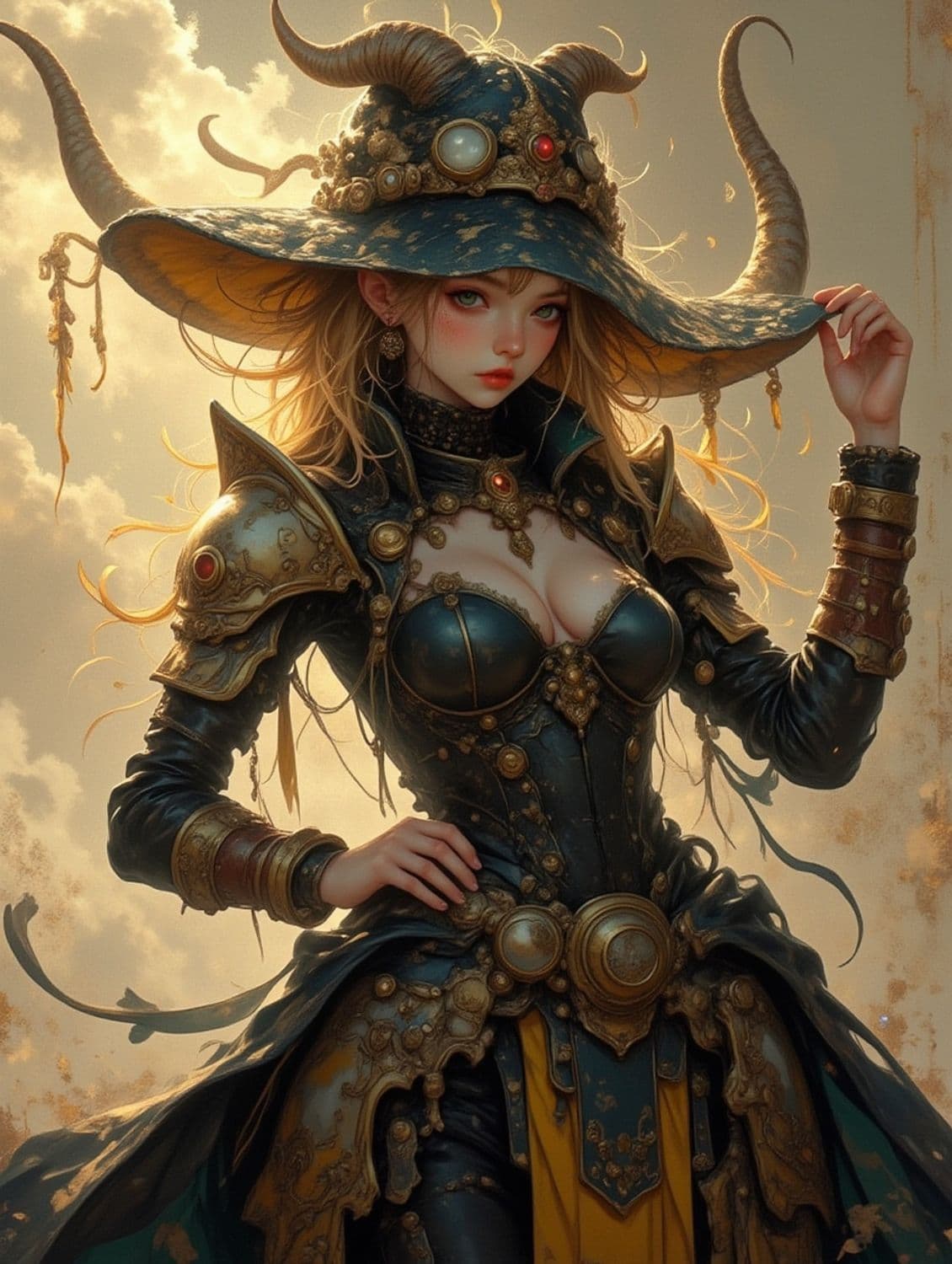 The image depicts a fantasy character adorned in intricate, armored attire, embellished with ornamental details. She has long, flowing hair and wears an opulent hat adorned with large horns and gemstones. The color palette is rich and earthy, combining golds, dark greens, and browns, with a warm, glowing background.