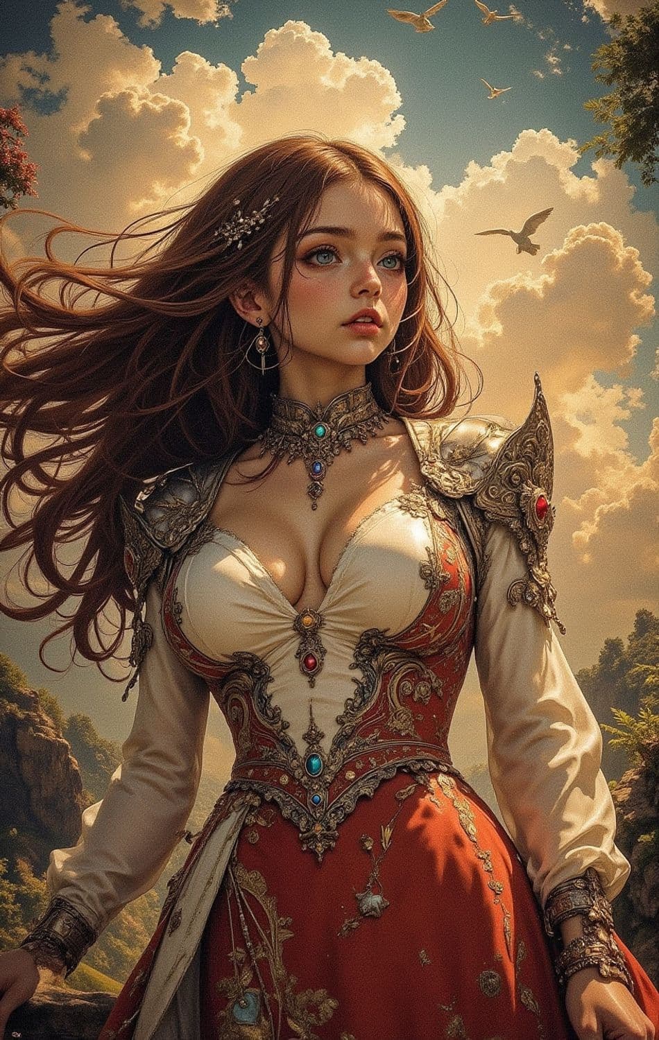 An elegant fantasy character stands amidst a dreamy backdrop of fluffy clouds and birds soaring in the sky. She is adorned in an intricately designed dress with ornate armor, featuring vibrant jewels. Her long hair flows freely, caught in a gentle breeze. The ethereal setting enhances her captivating presence.