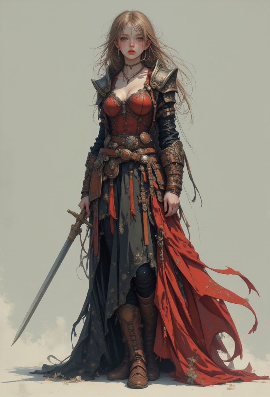 A warrior stands confidently, adorned in intricate armor with a blend of leather and metal details. Her long, flowing hair complements her striking red and black attire. She holds a large sword by her side, and her determined expression reflects her strength and courage.
