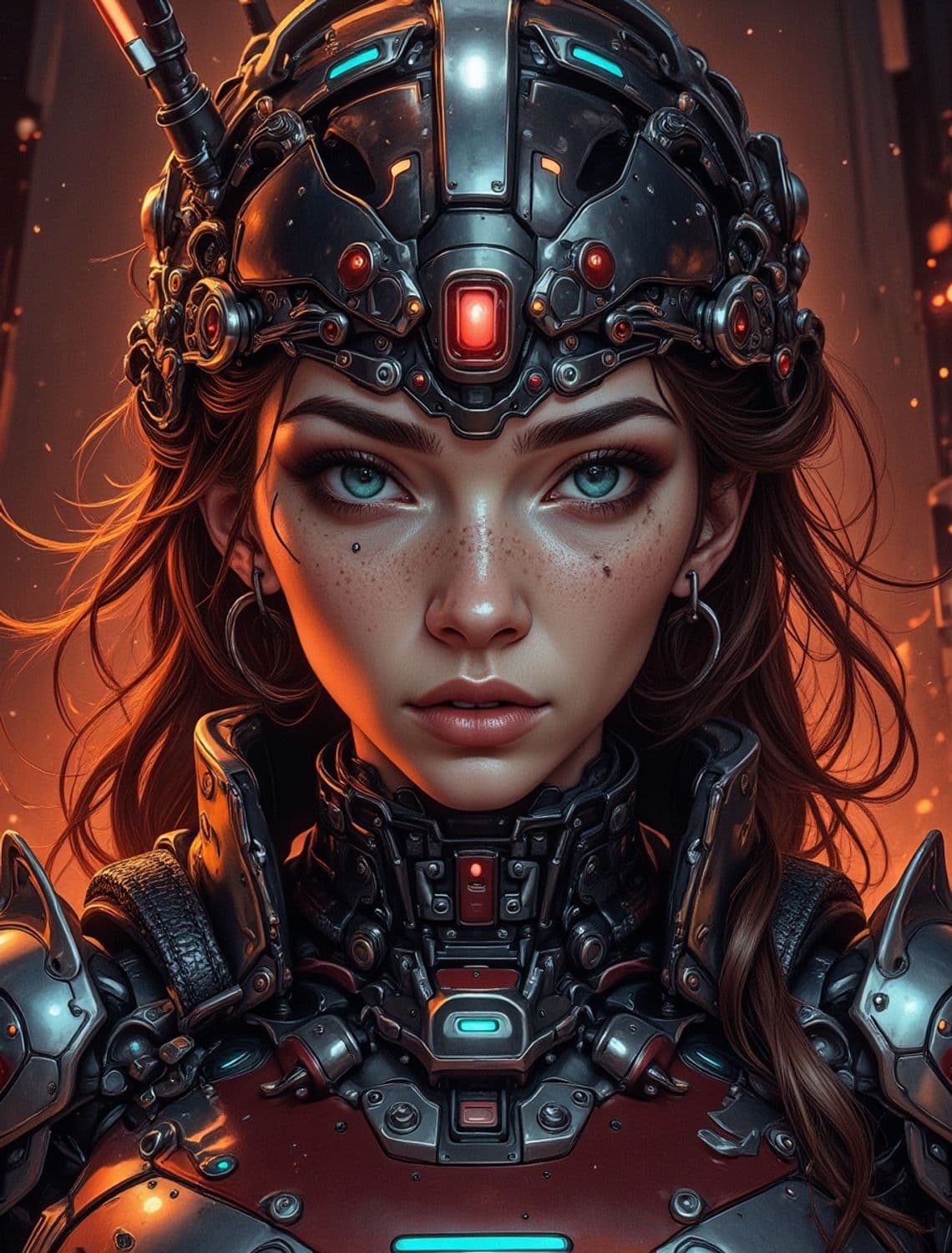 A futuristic female warrior with striking blue eyes is adorned in intricate cybernetic armor. Her helmet is detailed with glowing lights and mechanical components, adding a sense of advanced technology. Her expression is determined and focused, set against a softly lit background that enhances the metallic and vibrant accents of her gear.