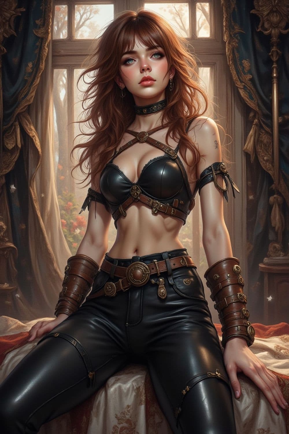The image features a striking woman with long, flowing brown hair, standing confidently in an ornate room. She is wearing a black leather bralette with numerous straps and brass buckles, paired with matching leather pants. Her wrists are adorned with brown leather bracers, intricately detailed with golden metal elements. The room is elegantly decorated with dark curtains and a soft, ambient light filtering through a large window in the background, adding an ethereal touch to the setting.