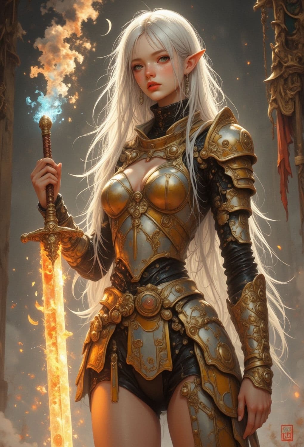 A striking fantasy warrior stands confidently, clad in intricately designed, golden armor that gleams with both elegance and power. Her long, white hair cascades down her back, framing her sharp elven features and pointed ears. She holds a flaming sword that emits a warm glow, illuminating the ethereal atmosphere around her. The background is adorned with ancient pillars, adding a mystical and regal feel to the enigmatic scene.