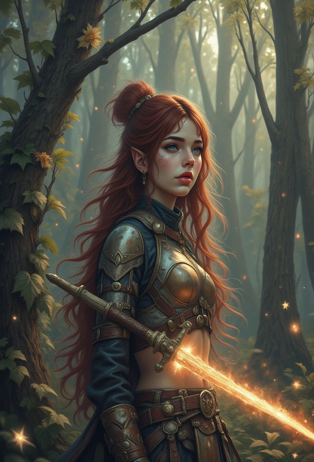 In an enchanted forest with a golden glow filtering through the trees, a mystical woman with fiery red hair and pointed elf ears stands confidently. She wears ornate armor that gleams with intricate designs and holds a glowing sword that radiates a magical energy. The forest around her is lush and filled with golden leaves, enhancing the ethereal ambiance.