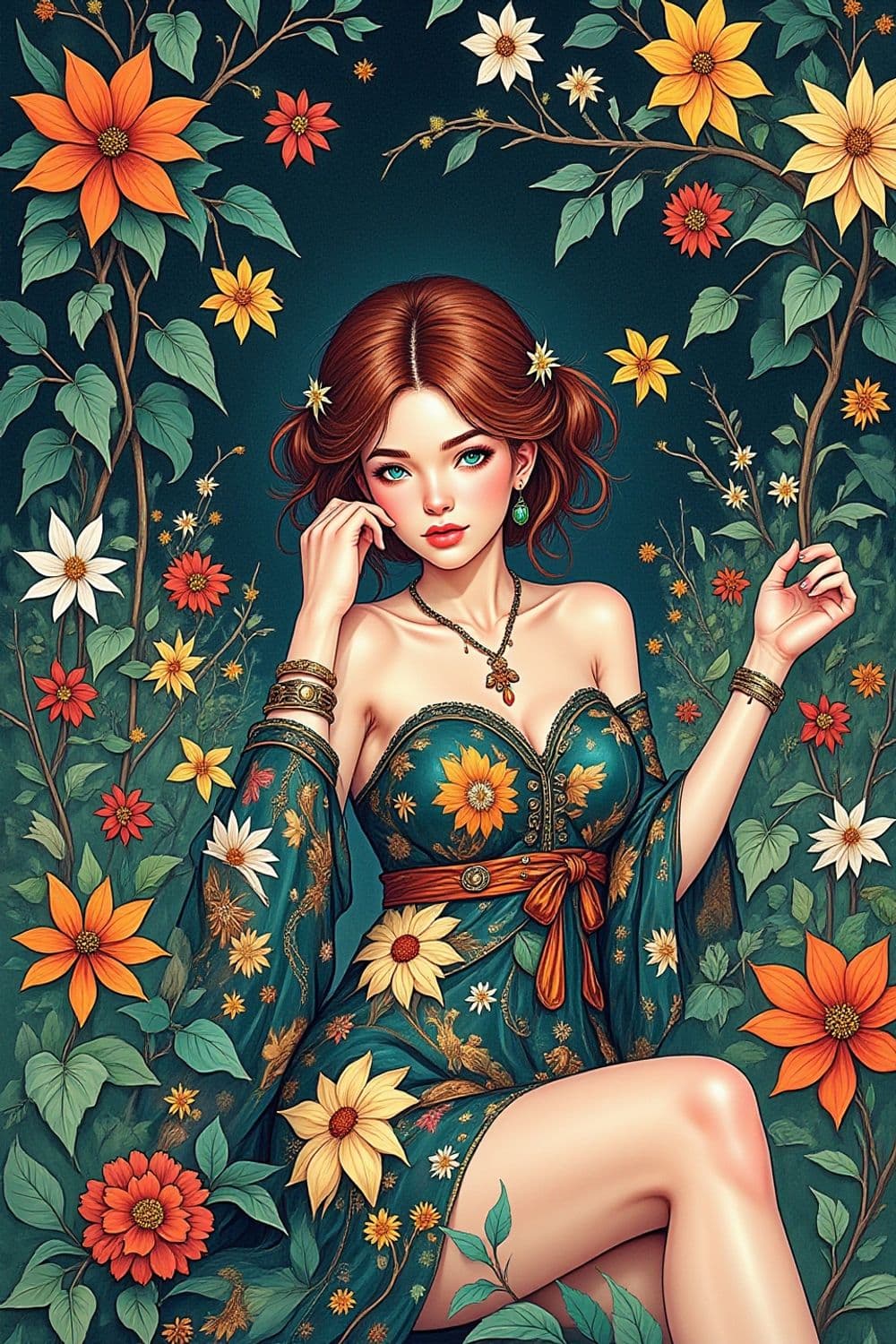 The image depicts a fantasy illustration of a woman seated amidst a lush floral background. She wears a dress adorned with vibrant flowers matching the ones surrounding her. Her auburn hair is styled neatly, with small floral accents. The woman holds a serene expression and has a pendant resembling a flower. The background is adorned with large, colorful flowers and green foliage, creating a natural yet mystical atmosphere.