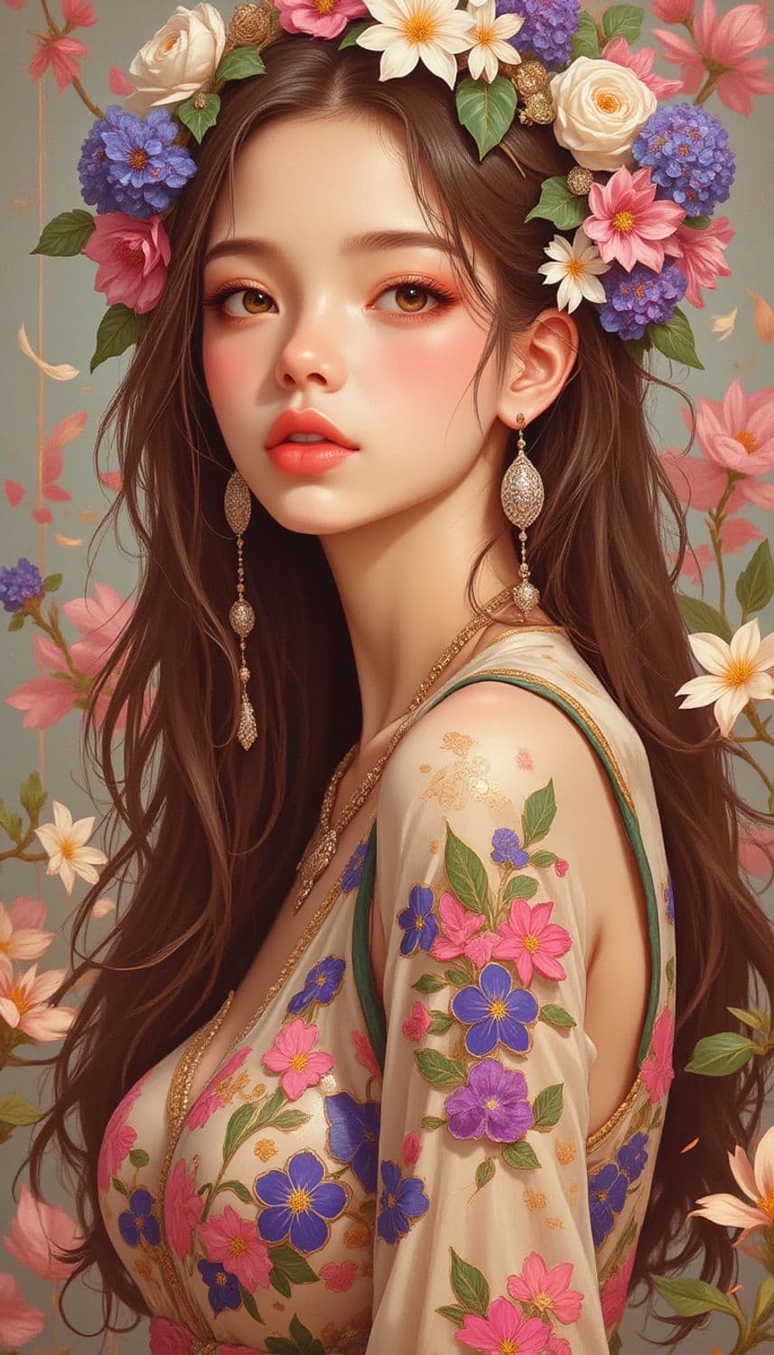 A portrait of a woman adorned with a crown of colorful flowers. She has long, flowing brown hair, and her expression is serene. The garment she wears is decorated with vibrant floral patterns. The background is subtly decorated with additional flowers, complementing the vivid colors of her attire and crown.