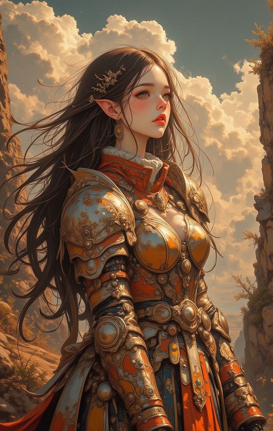 A striking fantasy warrior stands against a dramatic sky filled with fluffy clouds. Her long, dark hair flows elegantly in the wind, and her pointed ears peek out, adorned with gold accessories. The intricate armor she wears is a symphony of gold and orange, gleaming under the light. The setting resembles a rocky landscape, accentuating her imposing presence.