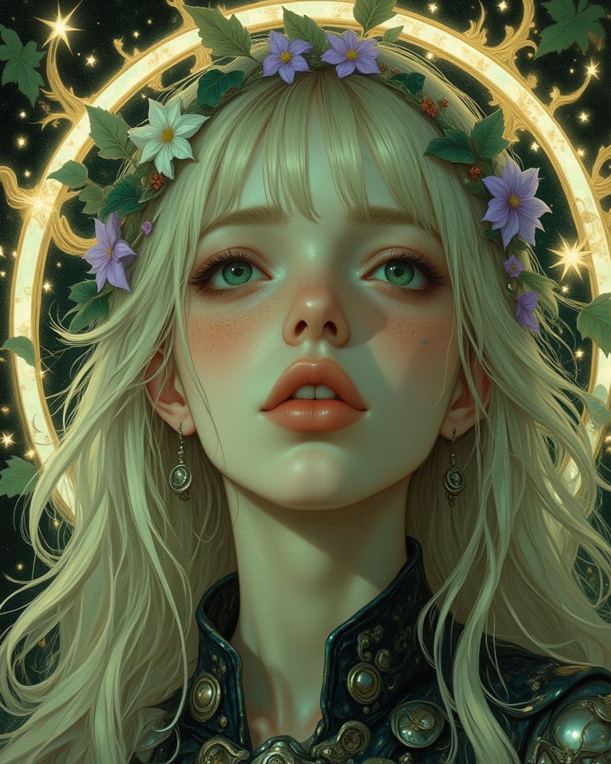 A captivating digital painting of a serene young woman with long, flowing blonde hair and soft, peach-toned lips. She wears an elegant crown of leaves and flowers, with a golden halo-like design glowing behind her. Her deep, thoughtful green eyes are accentuated by the softly glowing stars that surround her. She is adorned in an intricate dark garment decorated with ornate patterns that suggest regality.