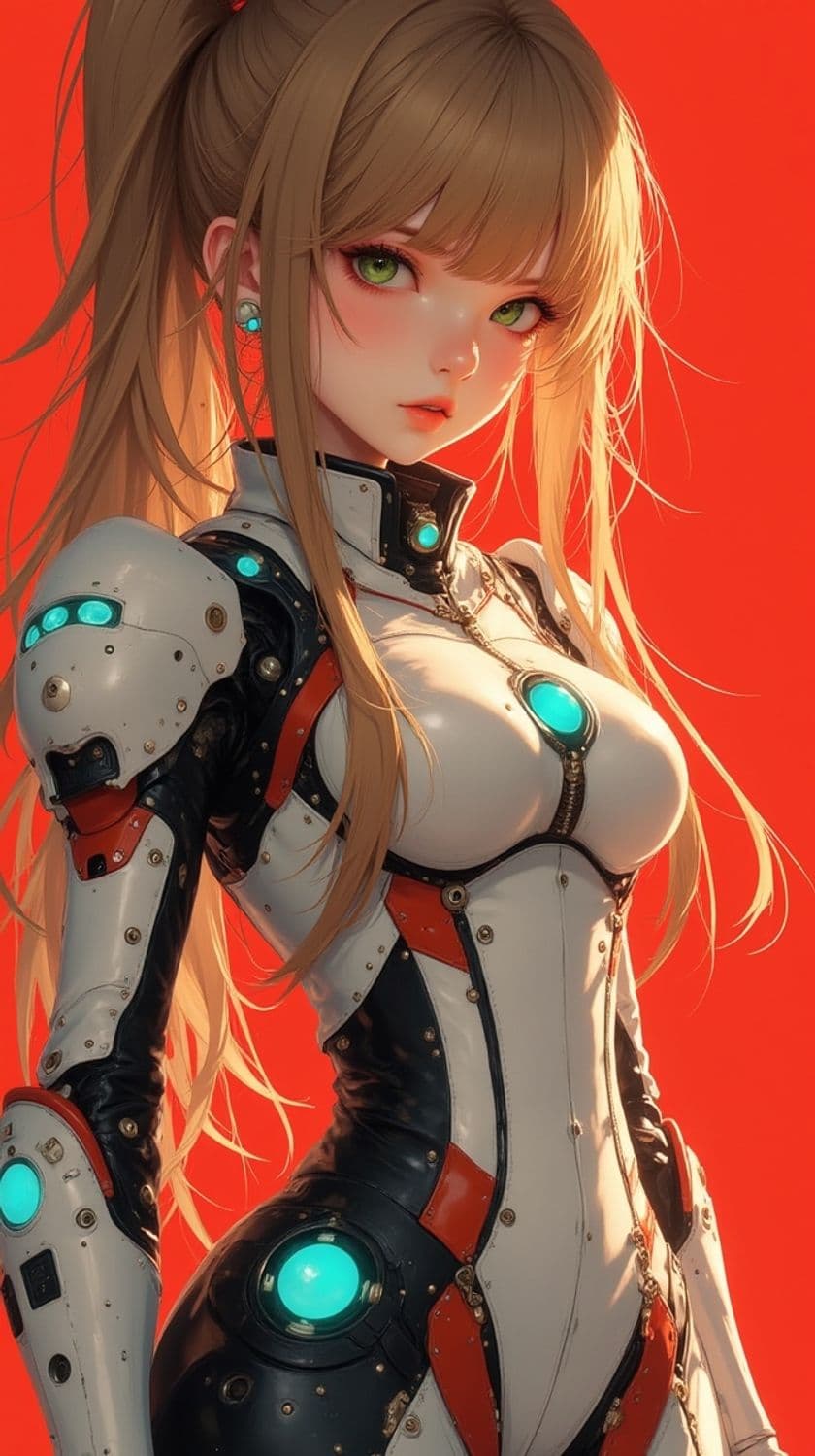 The image portrays a futuristic female character with long blonde hair tied in a high ponytail. She is wearing a high-tech suit with armor-like elements and glowing blue accents. Her striking green eyes add to her captivating presence, set against a vivid red background.