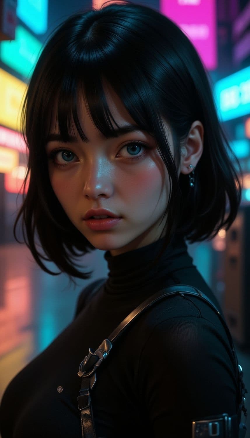 A striking portrait of a young woman with short, dark hair and captivating blue eyes, set against a vibrant, neon-lit urban background. She wears a sleek black outfit with shoulder straps, exuding a modern and mysterious aura.