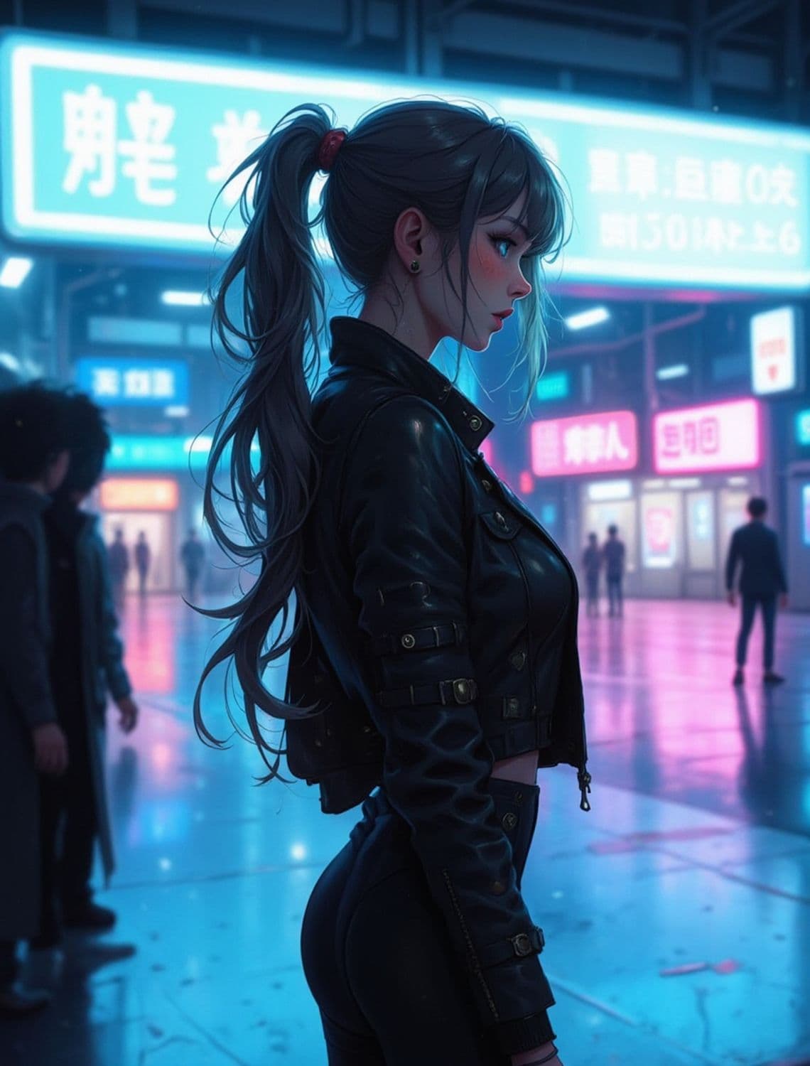 A captivating scene of a young woman with long hair in a ponytail standing in a futuristic city street. She is wearing a black leather jacket adorned with buckles, looking thoughtfully into the distance. The background is softly illuminated by neon signs in blue and pink hues, reflecting on the wet pavement, while silhouettes of passersby add depth to the urban nightscape.