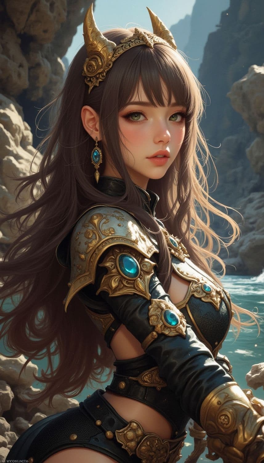 The image depicts a fantasy character with long hair and intricate armor. She wears a golden headpiece with horns and multiple blue gemstones embedded in her armor. The background features a rocky coastal landscape with water, providing a mystical and adventurous setting.
