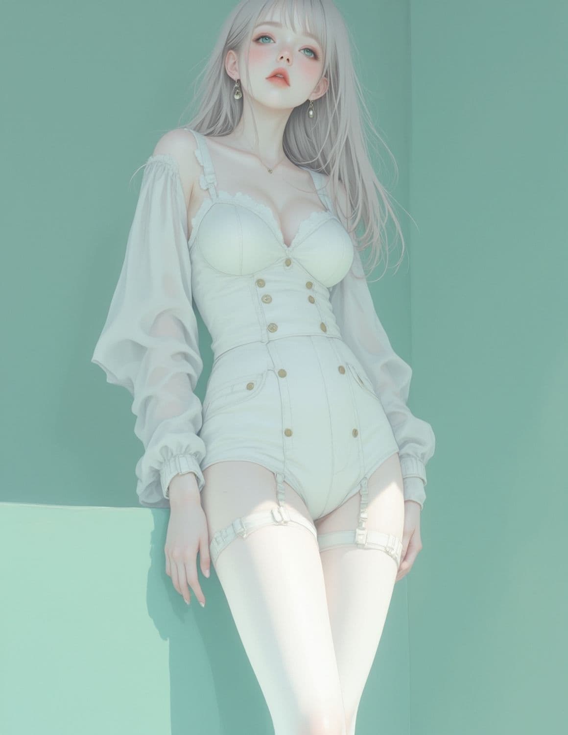 The image features a female character with long, flowing, silvery hair and a serene expression. She is wearing a chic, vintage-inspired outfit with a fitted corset-style top and high-waisted shorts, complete with garter straps. The backdrop is a soft, pastel mint green, complementing her ethereal, doll-like appearance and porcelain skin.