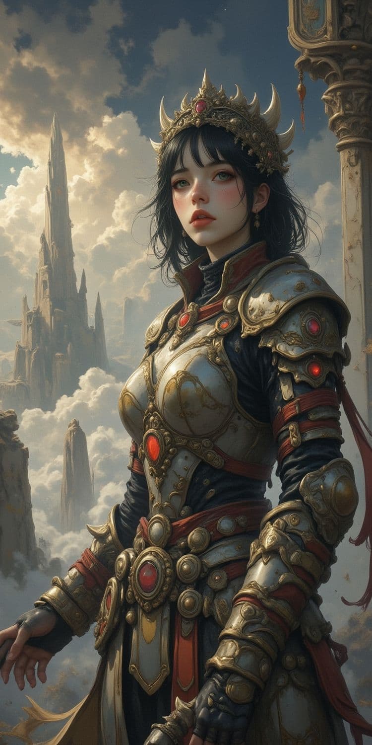A regal warrior stands against a backdrop of towering, jagged mountains and a sky filled with billowing clouds. She wears ornate, gold-trimmed armor adorned with red gemstones that complement her flowing black hair. Her crown, also golden and encrusted with jewels, gives her a commanding presence. The intricate detailing of her armor and the grandeur of the scenery evoke a sense of power and grace.