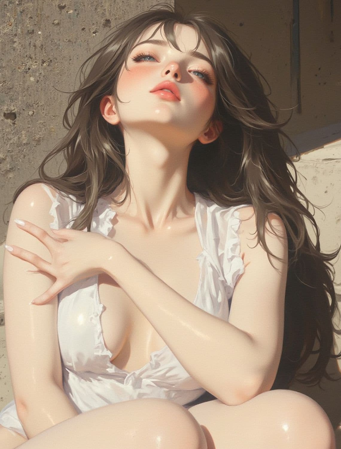 A digital artwork depicting a young woman with long, flowing hair and fair skin. She is wearing a sheer, white sleeveless top, with one hand gracefully positioned across her chest. The image is bathed in warm sunlight, highlighting her soft features and serene expression. The background consists of a textured wall, adding subtle contrast to the composition.